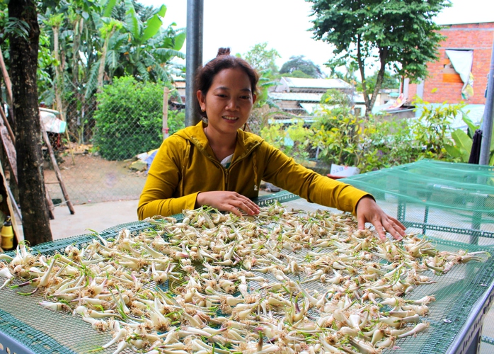 Chị tôi phơi củ kiệu hương chuẩn bị Tết.