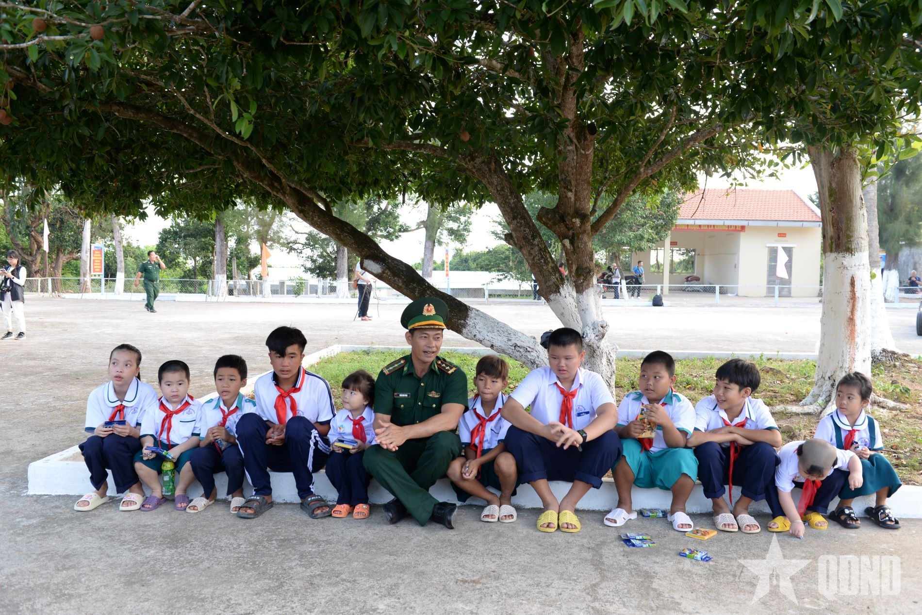 Những em nhỏ đủ mọi lứa tuổi quây quần bên người thầy mang quân hàm xanh, Trung tá QNCN Trần Bình Phục, ở đảo Hòn Chuối.