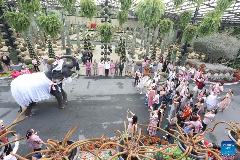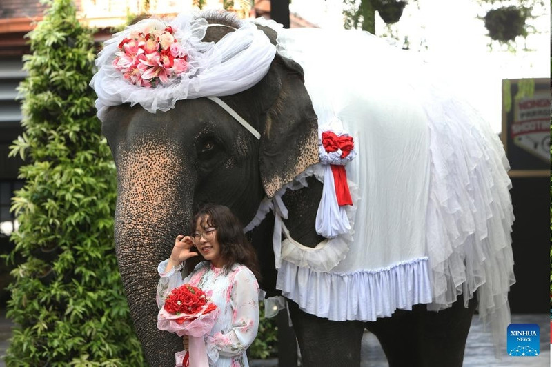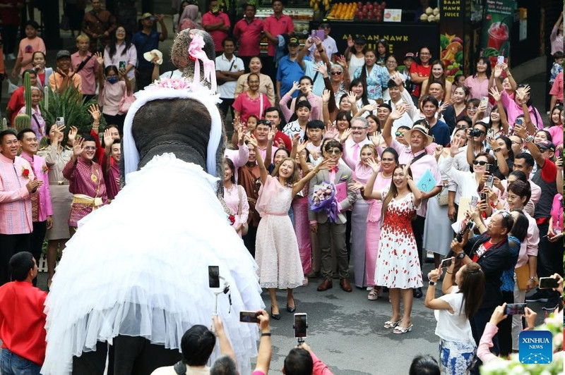 Một con voi tương tác với mọi người trong lễ cưới tập thể tại Vườn nhiệt đới Nong Nooch.