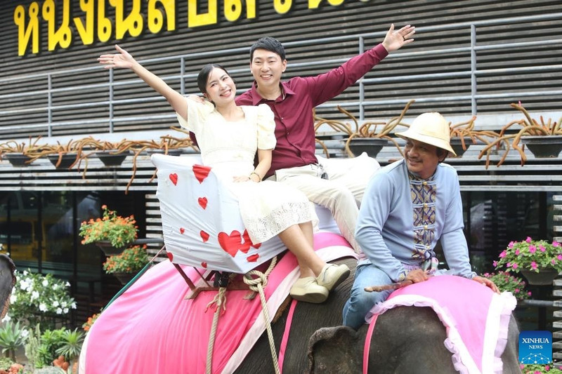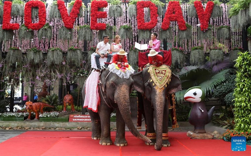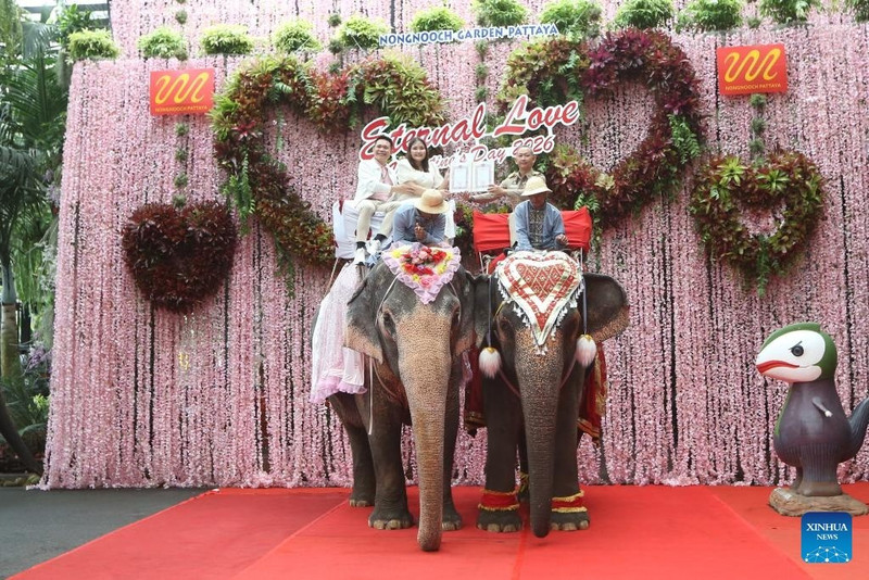 Một cặp đôi tạo dáng chụp ảnh trên lưng voi trong lễ cưới tập thể tại Vườn nhiệt đới Nong Nooch ở Pattaya, Thái Lan, ngày 14/2.