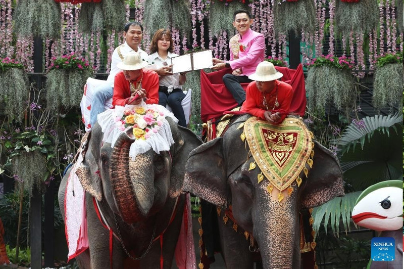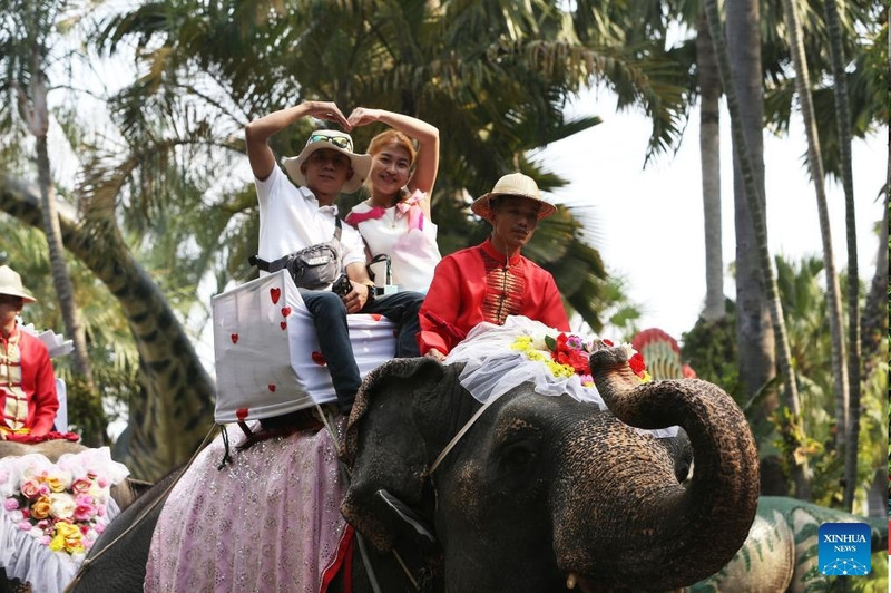 Một cặp đôi cưỡi voi trong lễ cưới tập thể tại Vườn nhiệt đới Nong Nooch ở Pattaya, Thái Lan, ngày 14/2.