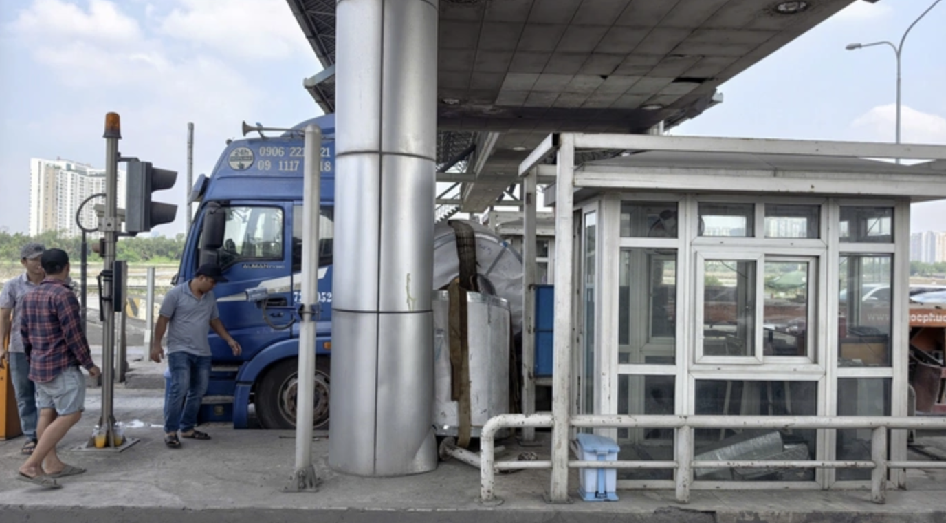 Khoảng 8 giờ 30 cùng ngày, nam tài xế lái xe đầu kéo thùng 40 feet chở 3 cuộn thép (loại 8 tấn/cuộn) chạy trên đường Võ Chí Công, hướng từ Khu Công nghệ cao TP.HCM đi cầu Phú Mỹ. Khi đến trạm thu phí cầu Phú Mỹ, phường Cát Lái thì 2 cuộn thép bị đứt xích, trượt vào phía đầu xe rồi rơi xuống cabin trạm thu phí.
