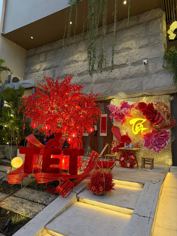 Trong loạt ảnh được đăng tải, căn biệt thự của gia đình Cường Đô La – Đàm Thu Trang được trang trí với tông màu đỏ làm chủ đạo, mang đậm không khí Tết cổ truyền. Không chỉ bài trí góc check-in quen thuộc, hai mẹ con còn cùng nhau trang trí thêm một chiếc cây màu đỏ nổi bật, treo lên đó những món đồ trang trí mang đậm sắc xuân.