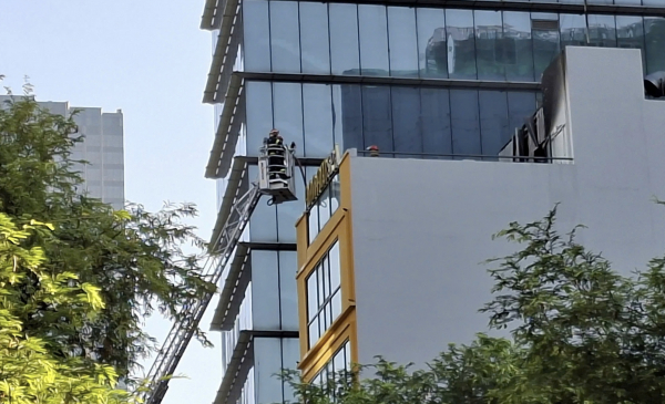 Cảnh sát sử dụng xe thang để cứu người mắc kẹt trên tầng 5.