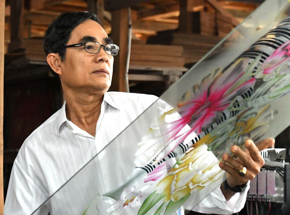 Cựu chiến binh Nguyễn Thanh Hòa kiểm tra sản phẩm tranh kính được in bằng công nghệ in 3D.