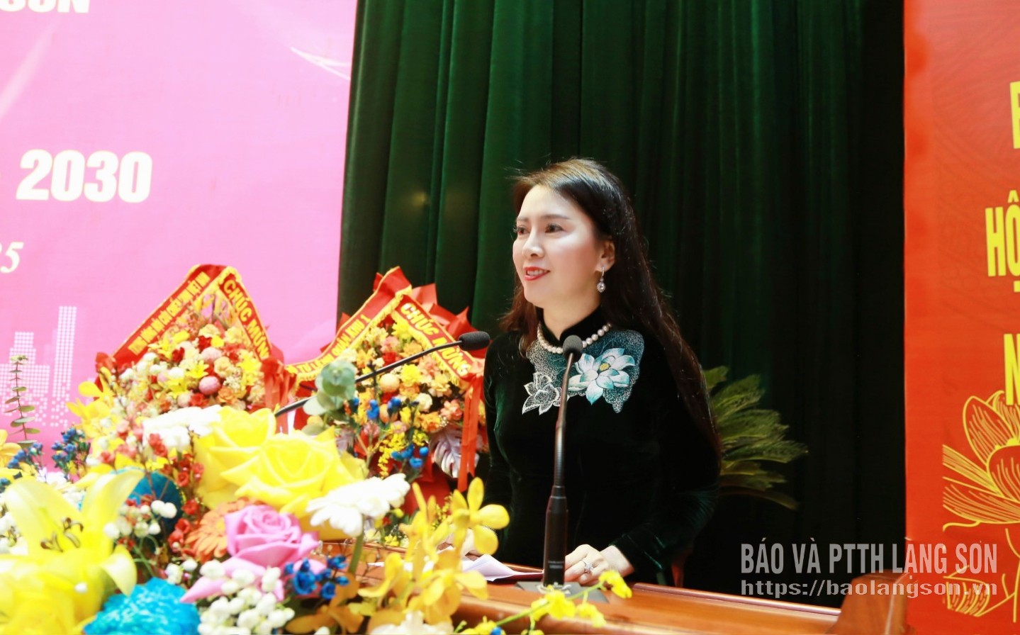 Đồng chí Đoàn Thu Hà, Phó Bí thư Tỉnh ủy, Chủ tịch Ủy ban MTTQ Việt Nam tỉnh Lạng Sơn phát biểu tại đại hội