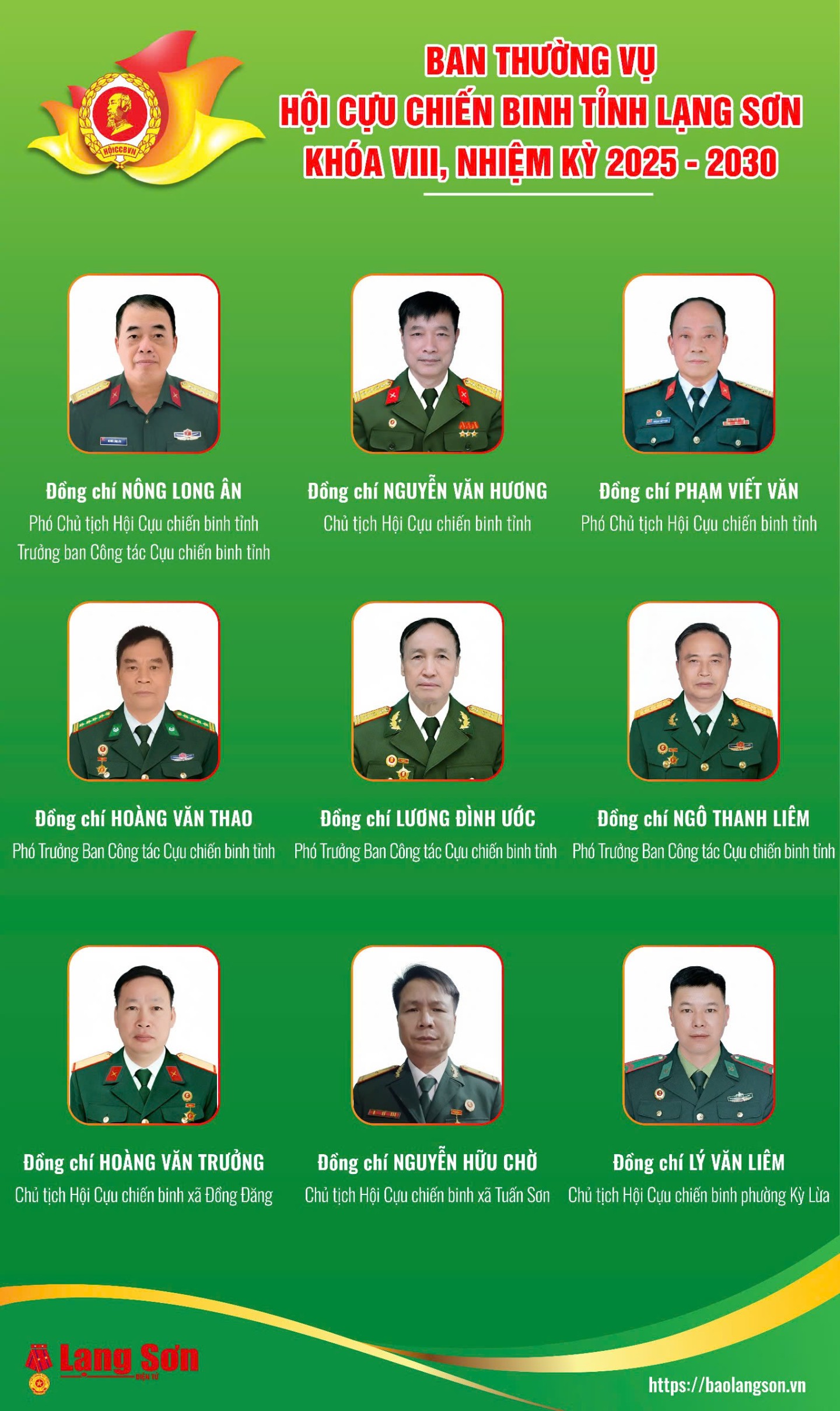 Đại hội đã bầu Ban Chấp hành Hội CCB tỉnh Lạng Sơn khóa VIII nhiệm kỳ 2025 - 2030 gồm 27 đồng chí. Tại phiên họp lần thứ nhất, Ban Chấp hành Hội CCB tỉnh khóa XVIII đã bầu Ban Thường vụ Hội CCB tỉnh gồm 9 đồng chí. Đồng chí Nguyễn Văn Hương, nguyên Phó Chỉ huy trưởng, Tham mưu trưởng Bộ Chỉ huy Quân sự tỉnh được bầu giữ chức Chủ tịch Hội CCB tỉnh khóa VIII nhiệm kỳ 2025 - 2030.