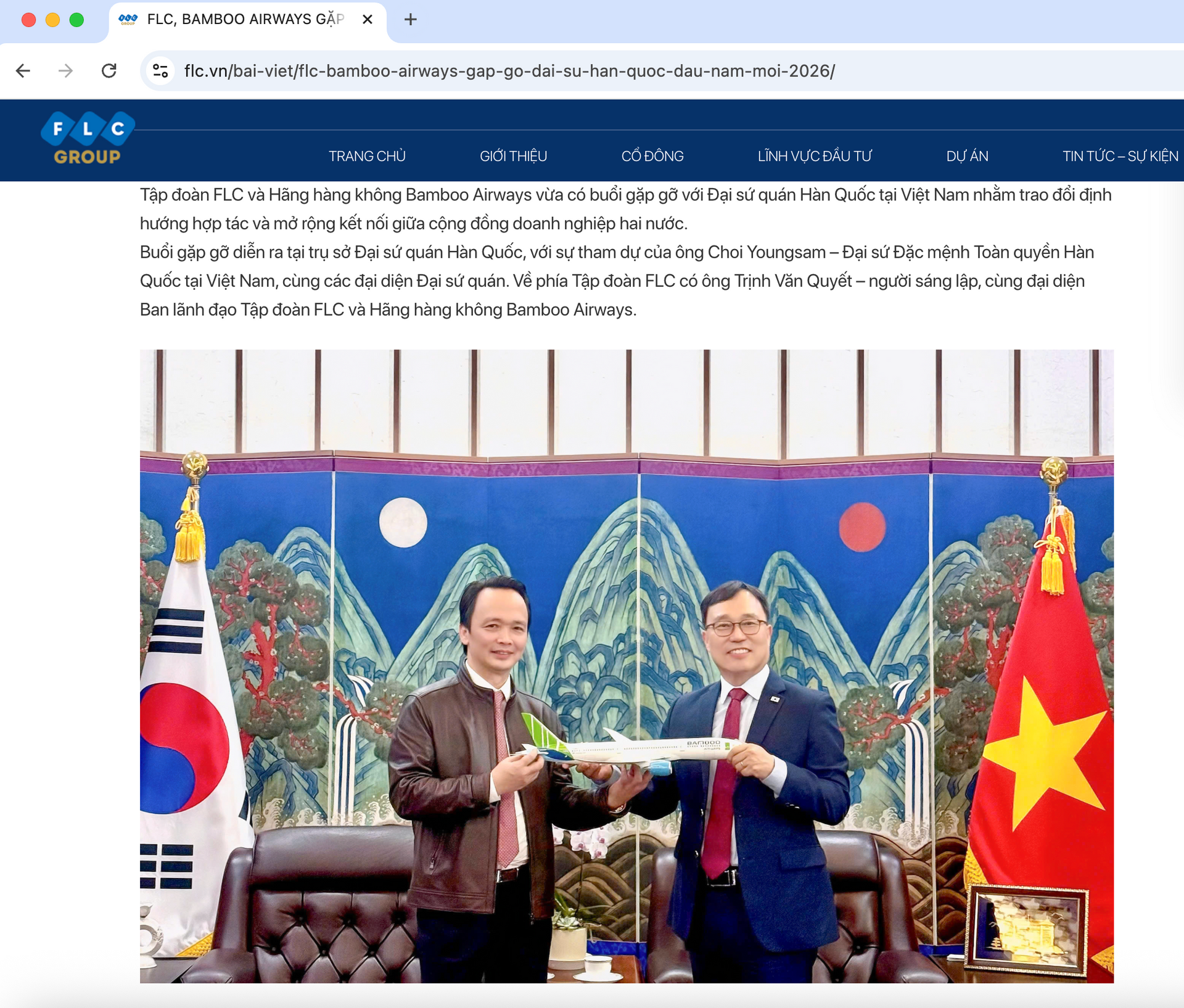 Hình ảnh, thông tin cuộc làm việc của ông Quyết với Đại sứ quán Hàn Quốc được đăng tải trên web của Tập đoàn FLC chính thức xác nhận ông Quyết đã ra tù trước thời hạn.