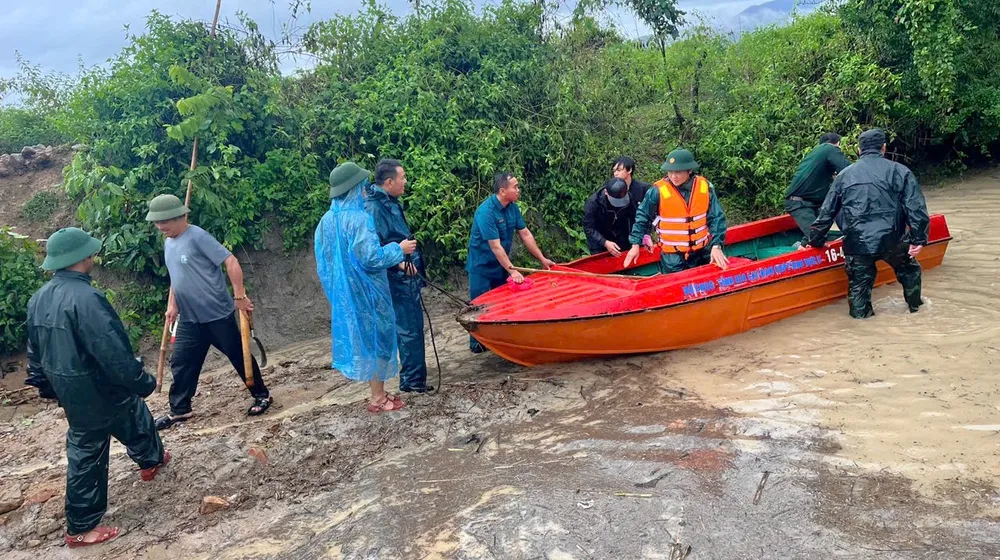 Bộ đội triển khai xuồng máy cứu hộ người dân trong mưa lũ. Ảnh: QK5