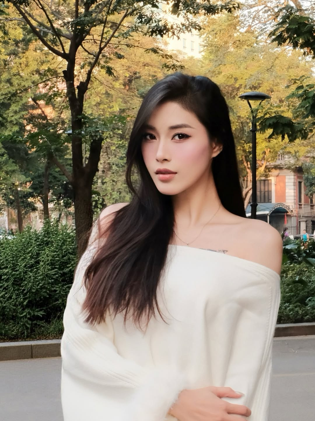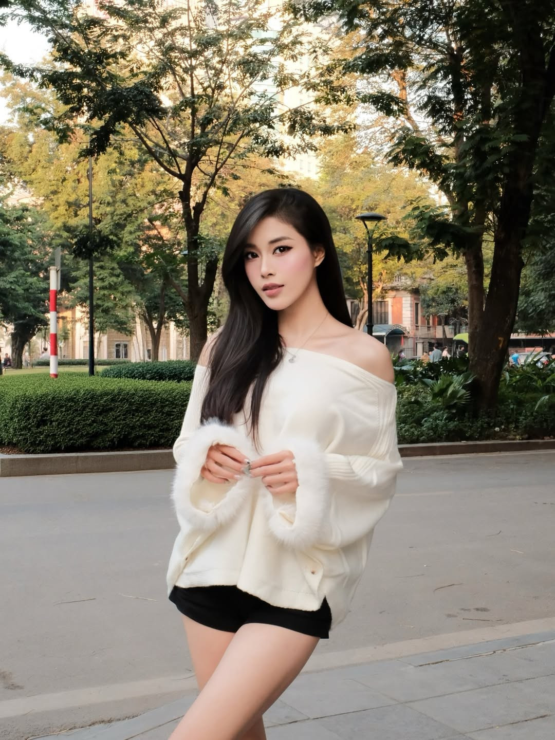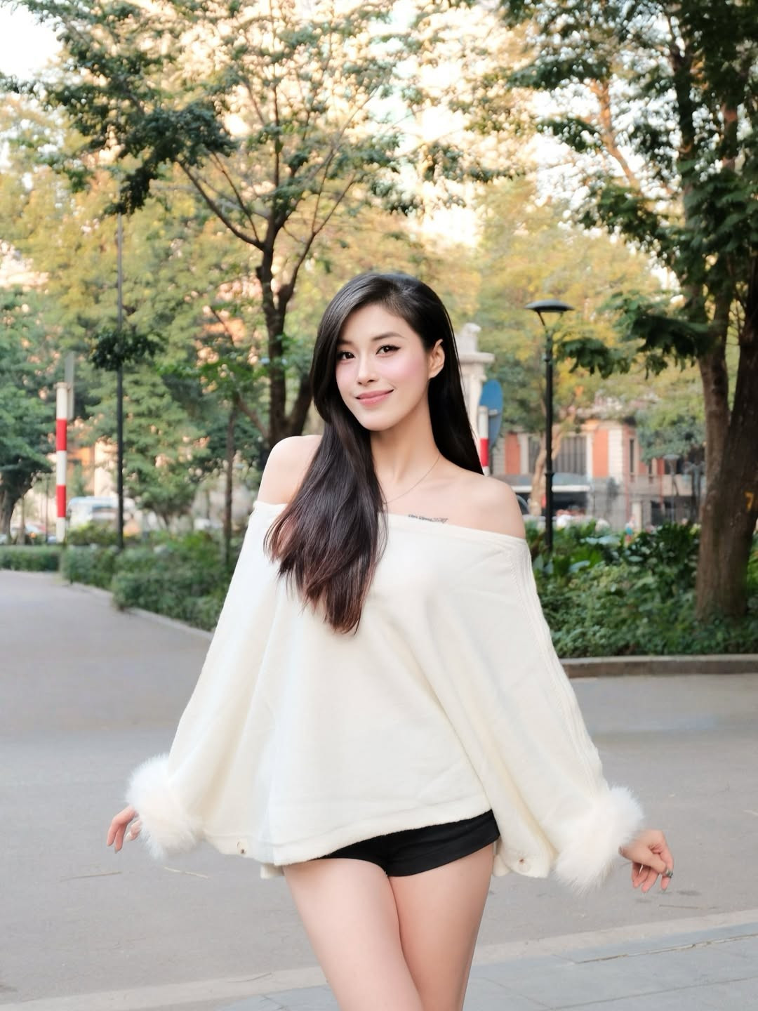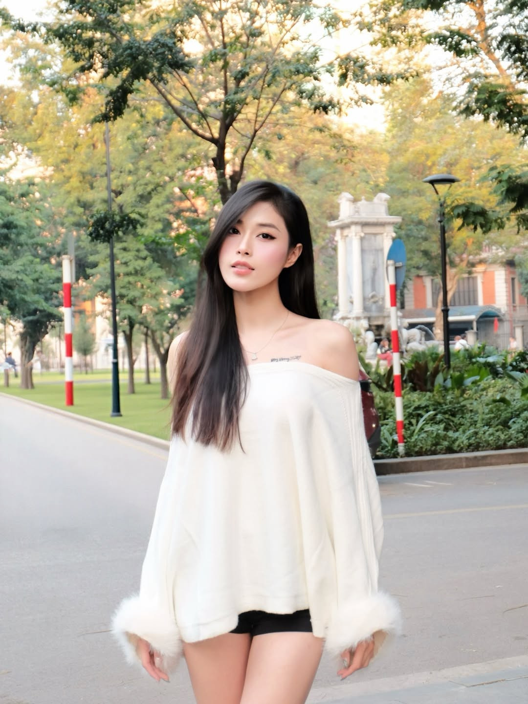 Chiếc áo lệch vai màu trắng mang đến vẻ đẹp vừa tinh khôi, vừa gợi cảm một cách tinh tế. Những chi tiết lông mịn ở tay áo tạo điểm nhấn mềm mại, khiến phong cách của cô trở nên sang trọng nhưng vẫn trẻ trung. Vóc dáng cân đối cùng đôi chân thon gọn càng giúp Thu Huyền thêm nổi bật giữa khung cảnh thiên nhiên xanh mát.