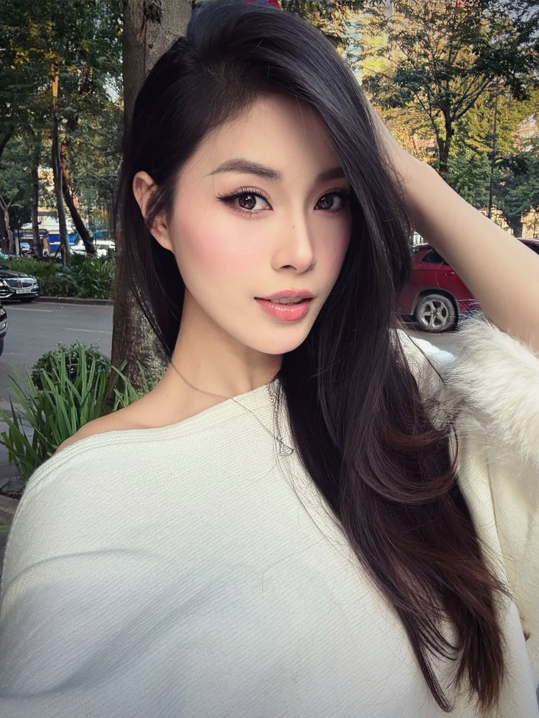 Cựu hoa khôi bóng chuyền Việt Nam trong loạt ảnh nổi bật với mái tóc đen dài mượt, được thả tự nhiên tôn lên nét nữ tính đặc trưng. Làn da trắng mịn cùng đường nét gương mặt mềm mại gây ấn tượng mạnh: đôi mắt to sắc sảo, hàng mi cong, sống mũi cao và bờ môi căng mọng giúp tổng thể thêm phần rạng rỡ.