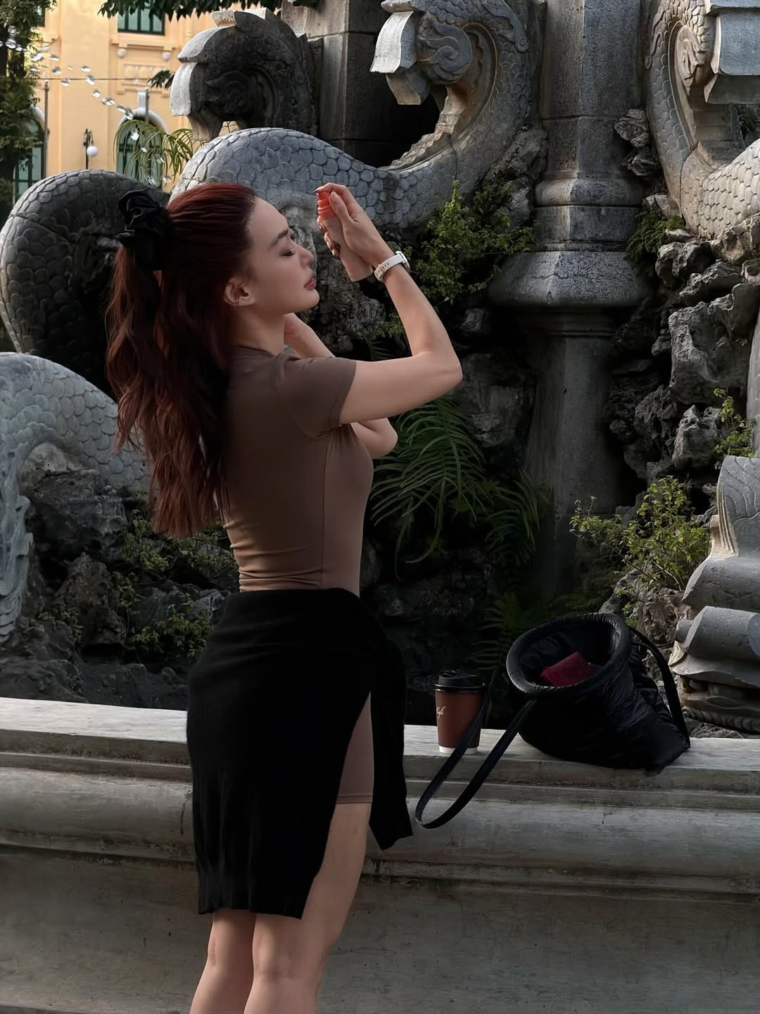 Mái tóc dài màu nâu đỏ được cô nàng buộc nửa đầu năng động làm nổi bật khuôn mặt thanh tú và thần thái rạng rỡ. Túi xách phồng lớn màu đen và chiếc đồng hồ đeo tay sành điệu giúp nâng tầm set đồ tập gym thành một outfit street style cá tính. (Ảnh: IGNV)