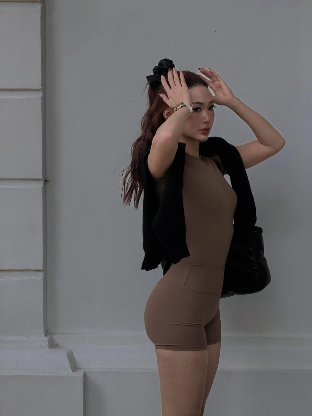 Trong bộ ảnh, Sun HT chọn một set đồ tập liền thân có gam màu nâu nude cực kỳ tôn da và tôn dáng. (Ảnh: IGNV)