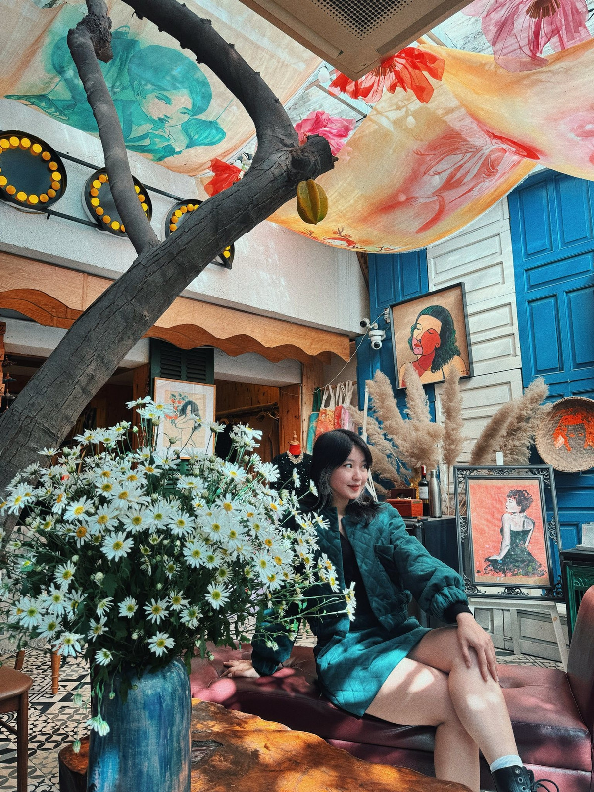 Bên cạnh đó, không gian nghệ thuật với tranh vẽ, rèm lụa và ánh sáng xuyên qua trần nhà mang lại cho bộ ảnh một chất thơ rất riêng. Những bông cúc họa mi trắng muốt đặt trong chiếc bình gốm xanh trở thành điểm nhấn, khiến vẻ đẹp của Mi Vân thêm phần tinh khôi và giàu cảm xúc.