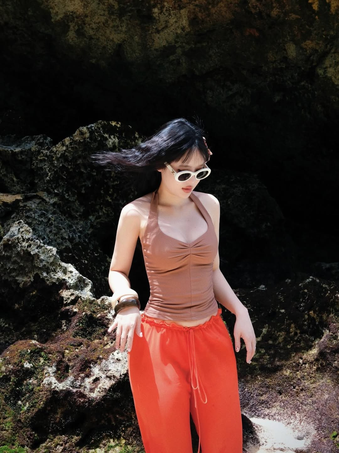 Chiếc áo dáng yếm nhẹ nhàng ôm trọn đường cong, kết hợp cùng quần màu cam rực rỡ mang đến cảm giác trẻ trung nhưng vẫn thời thượng.
