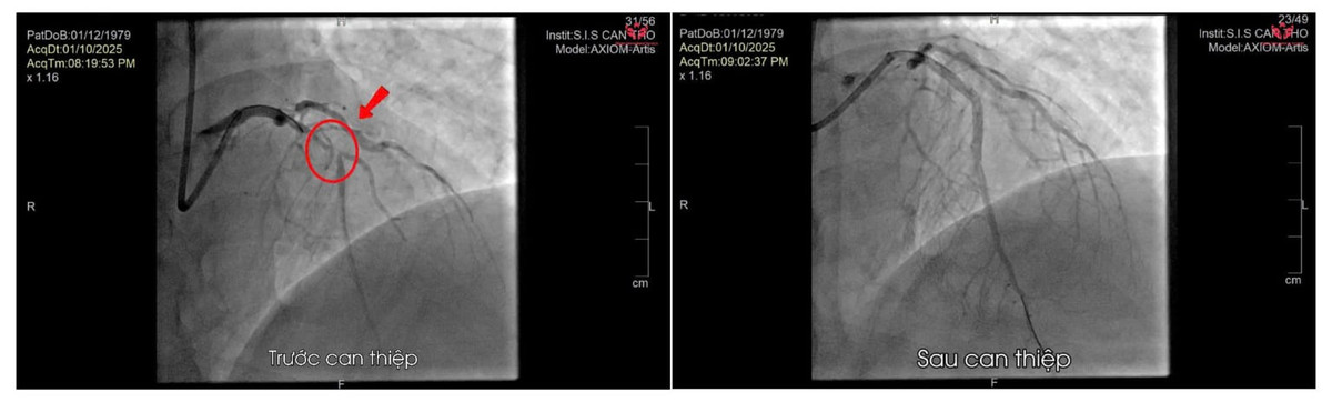 Ê-kíp tim mạch khẩn trương hội chẩn và chỉ định chụp mạch vành cấp cứu, phát hiện tổn thương hẹp rất nặng ở đoạn gần nhánh liên thất trước. Bệnh nhân được đặt stent mạch vành cấp cứu để tái thông dòng máu.