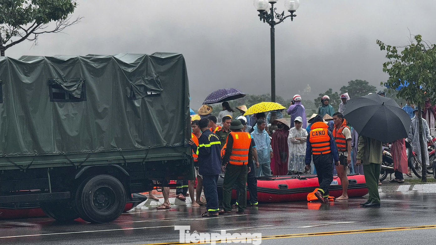 Lực lượng chức năng đưa phương tiện chuyên dụng, cứu nạn nhân bị mắc kẹt giữa dòng nước lũ.