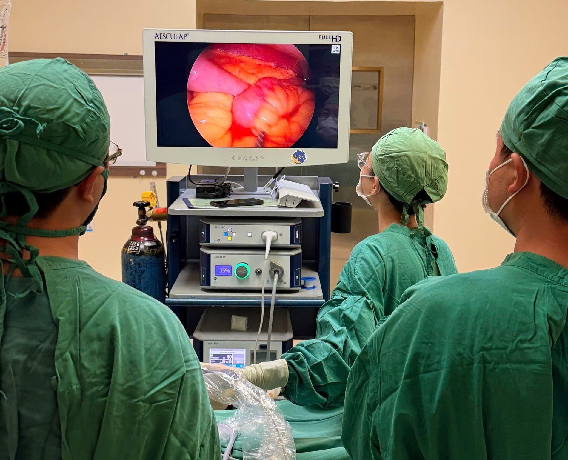 Trong quá trình nội soi, ê-kíp phát hiện bàng quang vỡ trong phúc mạc, nước tiểu rò vào ổ bụng kèm chảy máu.