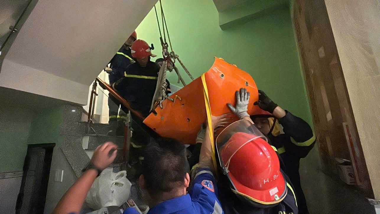 Với sự hỗ trợ của cáng cứu thương chuyên dụng, đội PCCC và CNCH đã áp dụng kỹ thuật chuyển vị an toàn và cố định cột sống để đảm bảo an toàn cho nạn nhân trong quá trình di chuyển xuống bằng lối thang bộ.