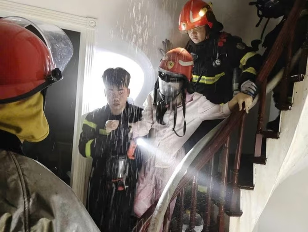 Nữ chủ nhà được giải cứu đưa ra ngoài an toàn.