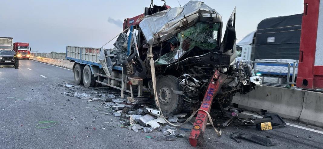 Xe tải BKS 36H-054.67 biến dạng hoàn toàn sau vụ tai nạn.