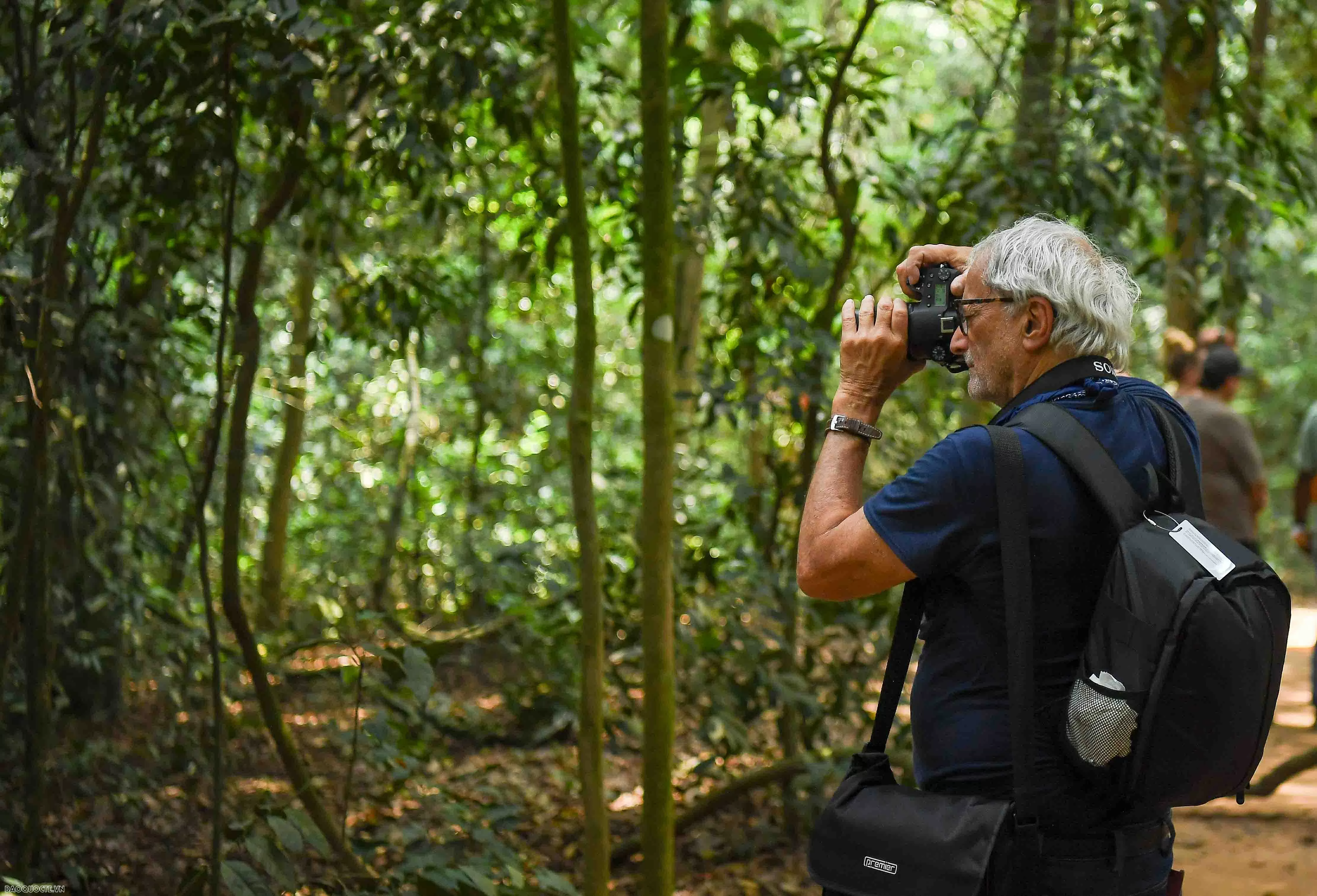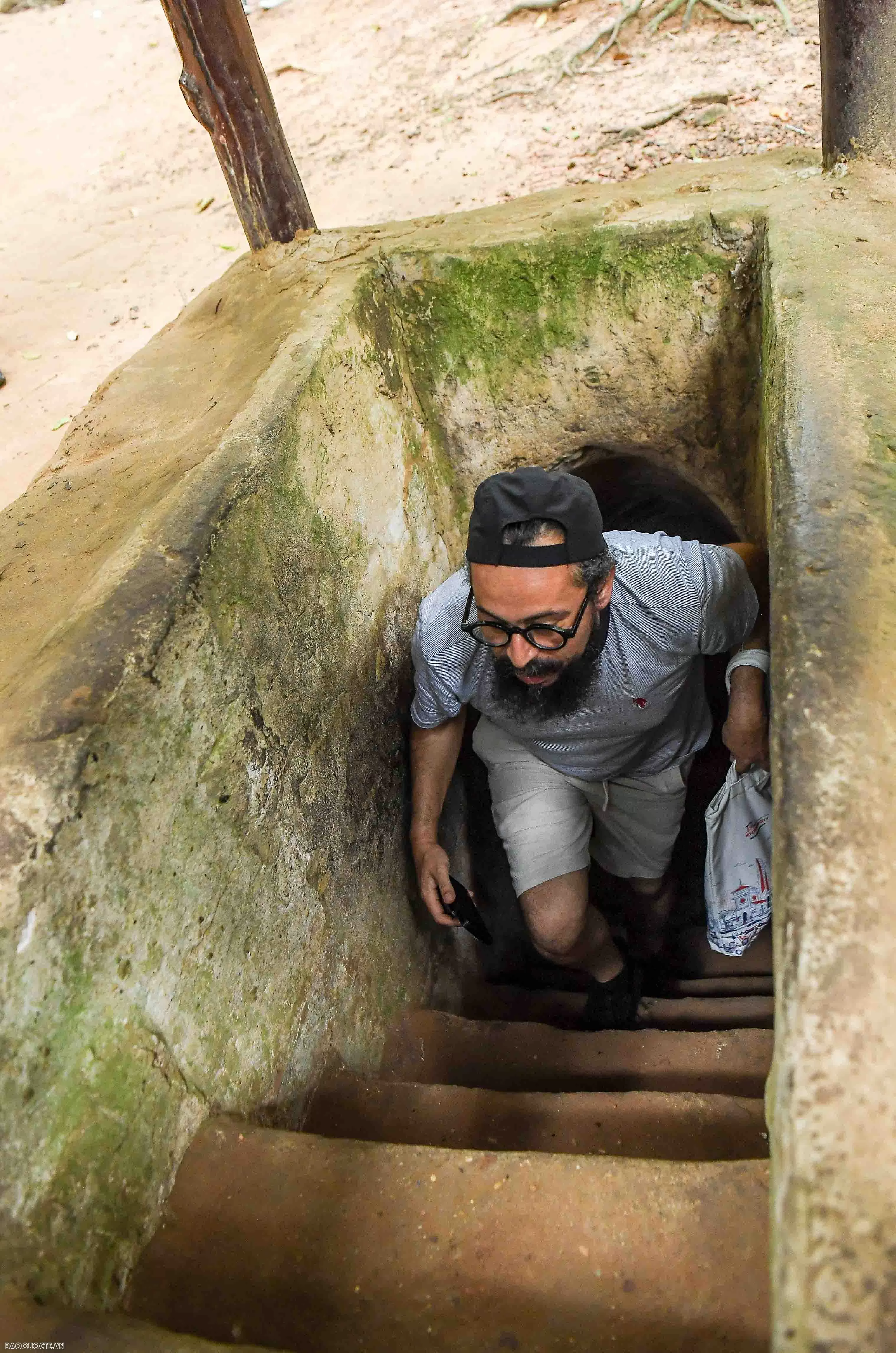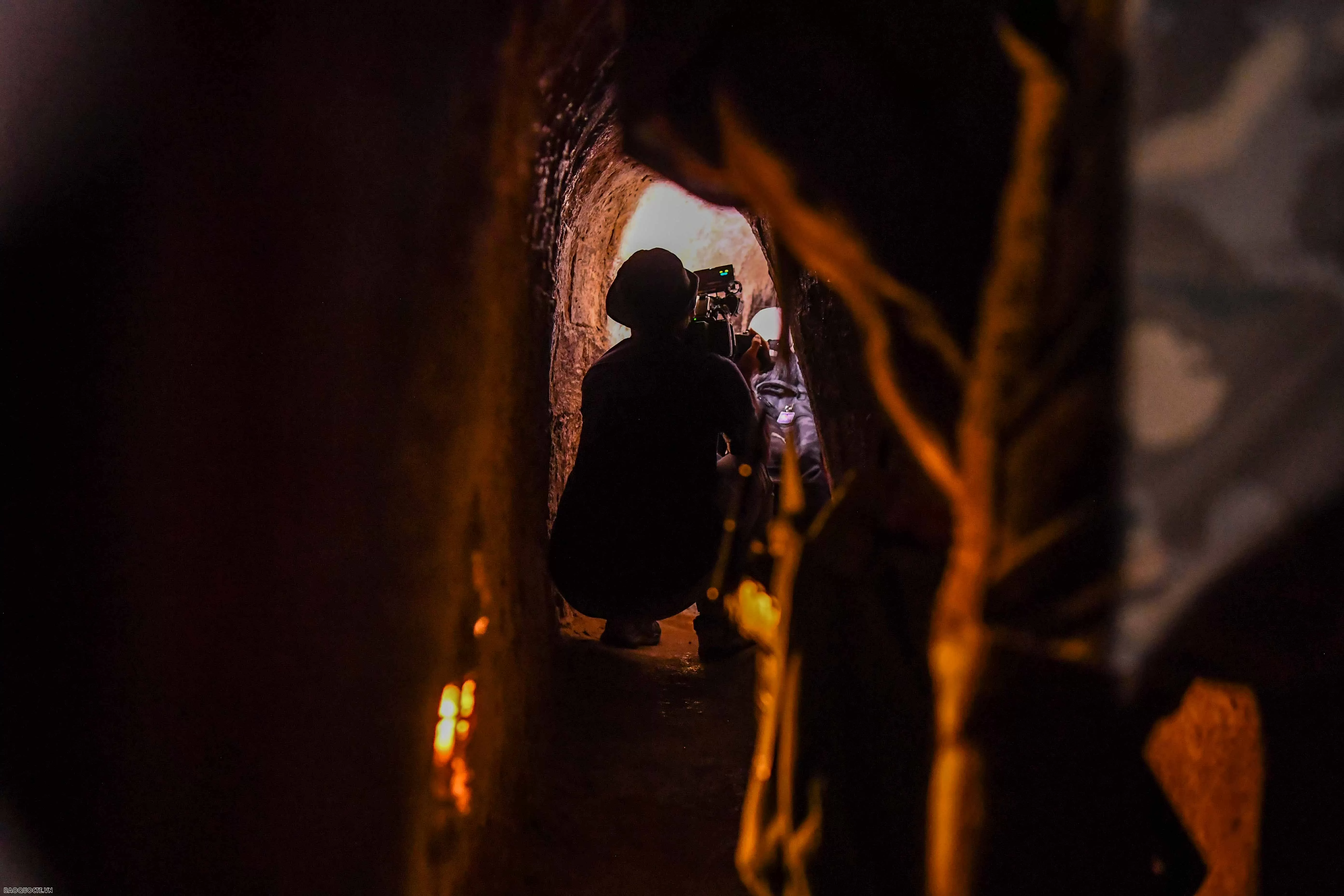 Ông David Burnett chăm chú ghi lại những hình ảnh tại mảnh đất thép Củ Chi và nhiều lần xuống hầm trải nghiệm. Sau chuyến đi, ông cho biết, bản thân vô cùng ngưỡng mộ tinh thần của nhân dân Việt Nam - những người dù phải trải qua cuộc chiến tranh trong hoàn cảnh thiếu thốn, không có nhiều vũ khí hiện đại, phải “tùy cơ ứng biến” thích ứng với mọi hoàn cảnh, nhưng đã rất gan dạ và thông minh, điều đó đã giúp Việt Nam chiến thắng Mỹ. (Ảnh: Nguyễn Hồng)