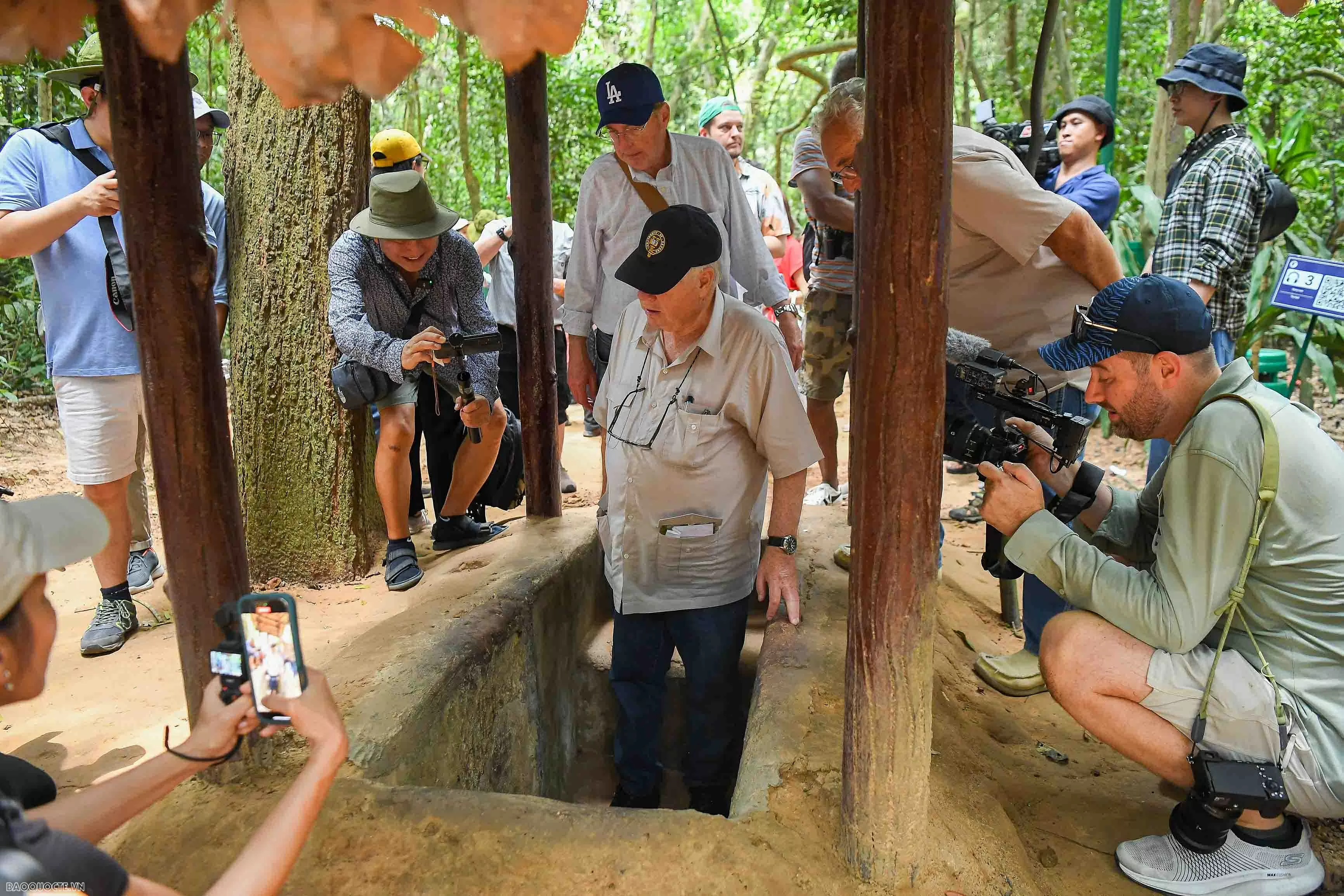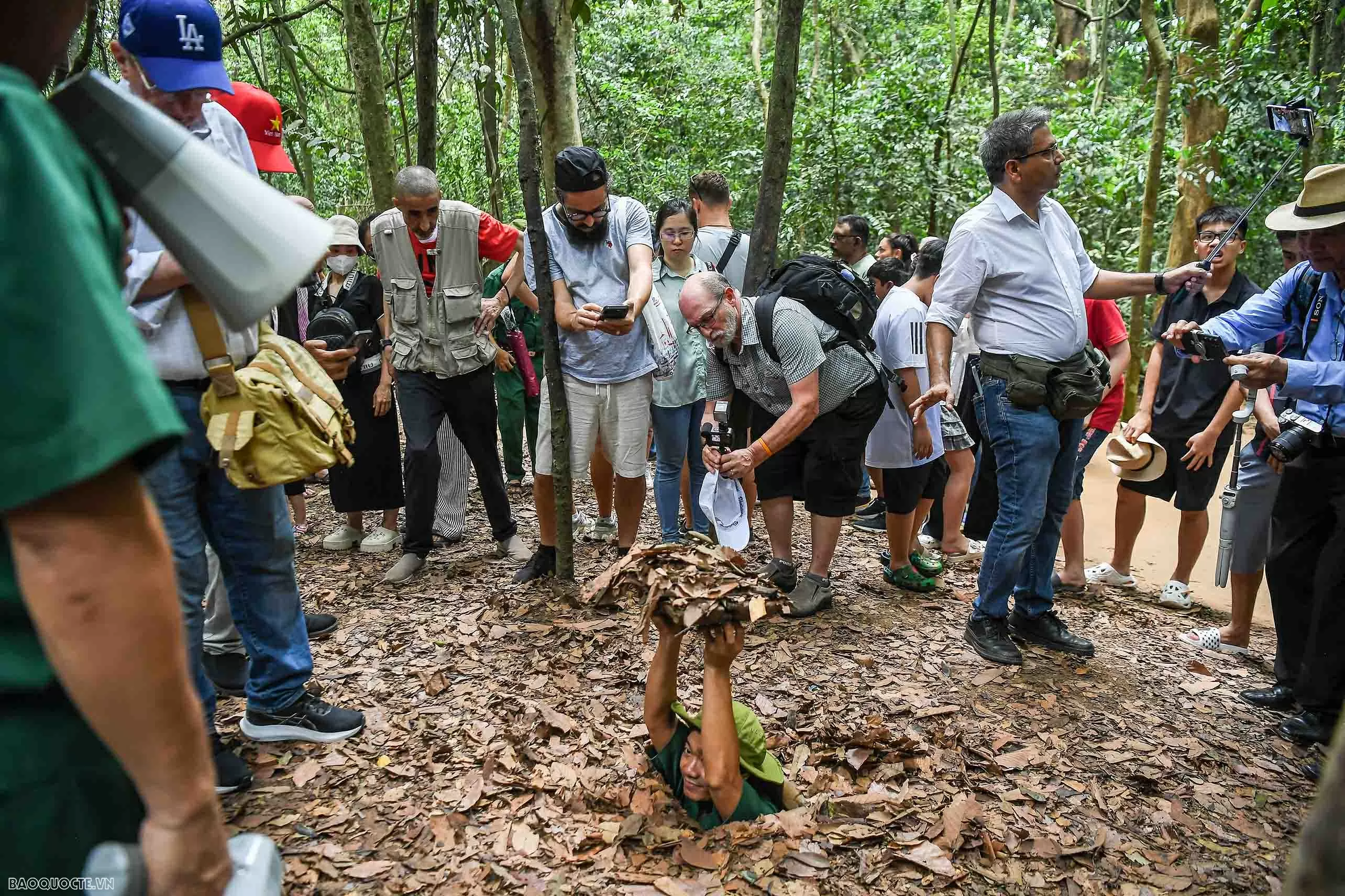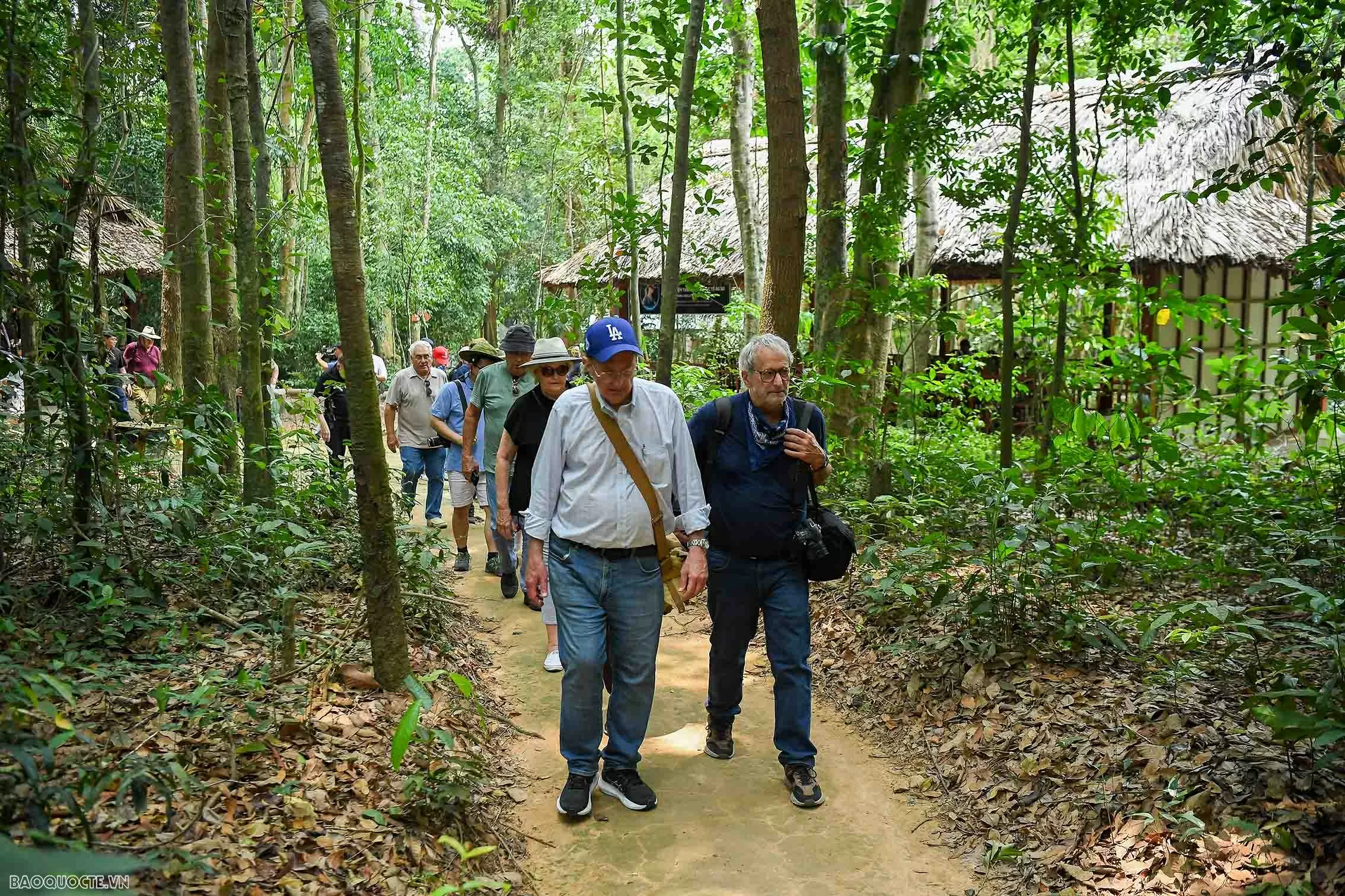Một ngày trước ngày lễ kỷ niệm 50 năm Ngày Giải phóng miền Nam thống nhất đất nước, ngày 29/4, đoàn gồm các cựu phóng viên chiến trường từng đưa tin về chiến tranh tại Việt Nam, phóng viên từ một số nước trực tiếp hỗ trợ cuộc kháng chiến của Việt Nam và phóng viên kiều bào đã có hành trình đến thăm địa đạo Củ Chi - địa điểm biểu tượng cho ý chí kiên cường và sức sáng tạo vô song của quân và dân ta. (Ảnh: Nguyễn Hồng)