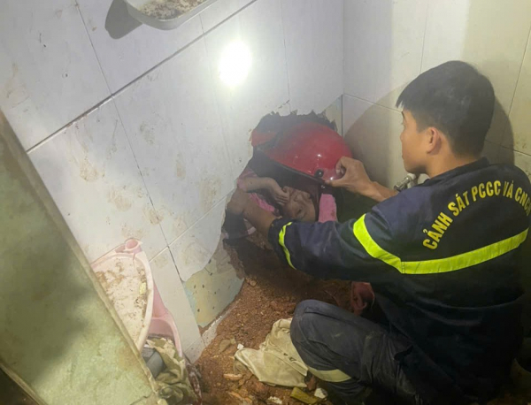 Trước lượng đất đá rất lớn vùi lấp, đè sập một phần căn nhà, lực lượng chức năng đã phải dò tìm vị trí nạn nhân đang bị mắc kẹt phía dưới. Sau khi xác định được nơi cháu bé, CBCS Phòng Cảnh sát PCCC-CNCH Công an tỉnh Lâm Đồng đã đục thủng tường bê tông, tiếp cận được nạn nhân nhưng chỉ được phần đầu. Toàn bộ phần thân và hai chân cháu bé đang bị đất đá, bê tông đè lên, không có cách nào đưa ra ngoài được.