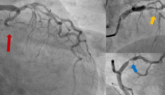 Hình ảnh chụp động mạch vành cho thấy tắc hoàn toàn động mạch mũ (mũi tên đỏ), hẹp nặng cả động mạch liên thất trước (mũi tên vàng) và động mạch vành phải (mũi tên xanh).