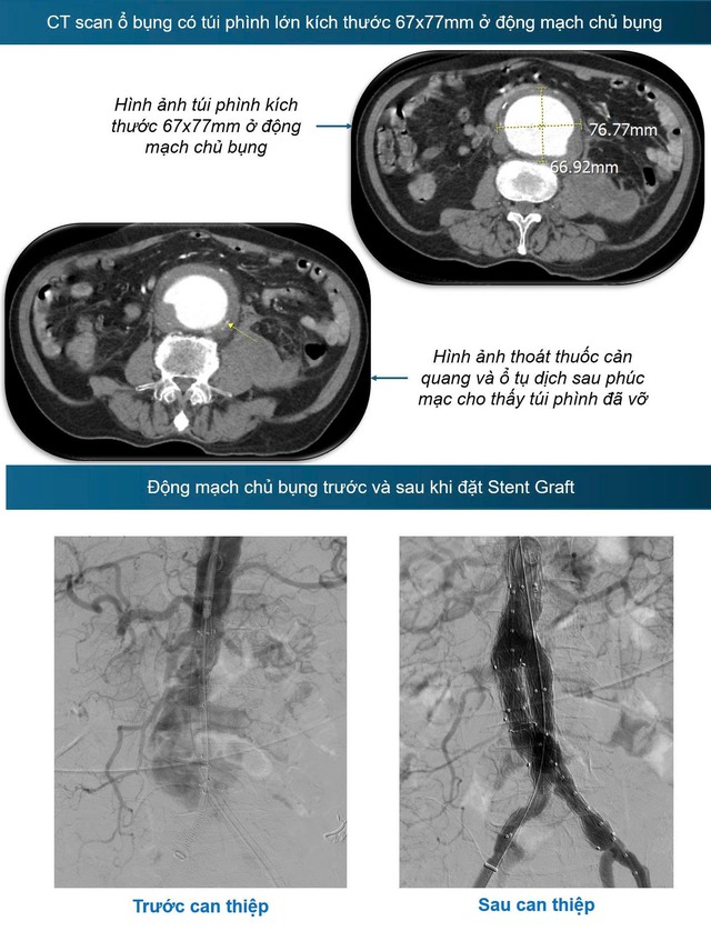 Khoa Nội tim mạch (Bệnh viện Hữu Nghị) vừa tiếp nhận một trường hợp bệnh nhân nam (76 tuổi) nhập viện vì đau bụng và có dấu hiệu thiếu máu nặng. Qua khai thác bệnh nhân cho biết 1 năm trước bệnh nhân được chẩn đoán phình động mạch chủ bụng nhưng vì kích thước còn nhỏ 4,3cm, không có triệu chứng nên chưa có chỉ định can thiệp, bệnh nhân có kèm theo tiền sử tăng huyết áp.