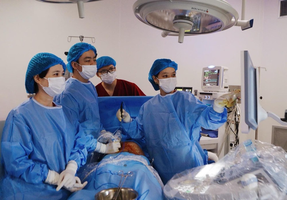 Ê kíp Bệnh viện Phụ sản Hà Nội thực hiện kỹ thuật can thiệp bào thai. Ảnh: T.L