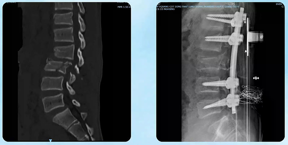 Khoa Ngoại Thần kinh: Tiến hành phẫu thuật vào cột sống lối sau, nắn trật cột sống đoạn L2–L3 và làm vững toàn bộ đoạn cột sống bị tổn thương bằng nẹp vít cuống cung dưới hướng dẫn C-arm; Đồng thời cắt bản sống L2–L3, lấy máu tụ ngoài màng tủy giải phóng chèn ép tủy, xử lý vùng tủy dập và vá màng tủy bị tổn thương.