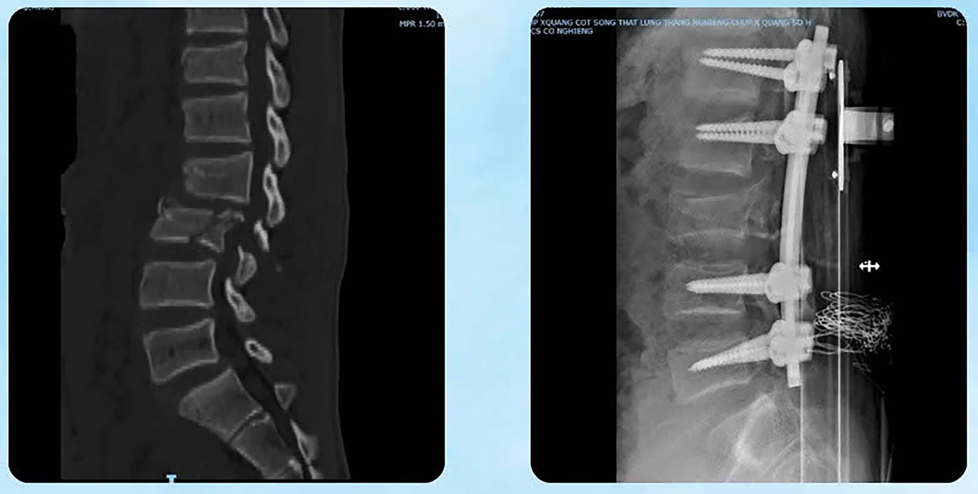 Kết quả chẩn đoán cho thấy, bệnh nhân bị tổn thương nặng ở nhiều cơ quan: Chấn thương ổ bụng, gãy thân xương đùi, tổn thương phần mềm vùng bụng lưng chậu, chấn thương lồng ngực và thận. Đặc biệt, bệnh nhân bị gãy trật cột sống nặng tại đoạn L2–L3, kèm máu tụ ngoài màng tủy, tủy dập và rách màng tủy.