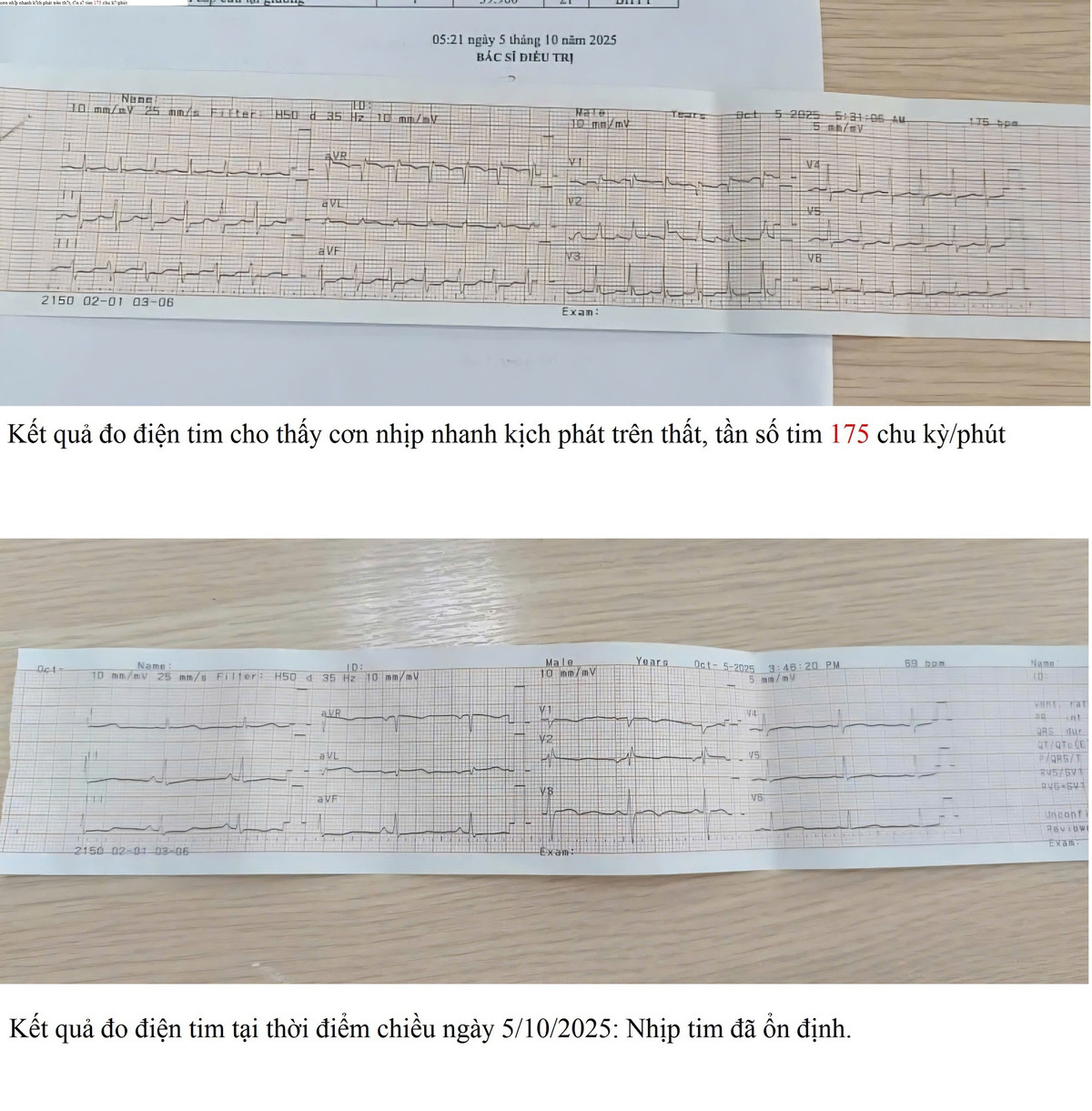 Ngay sau sốc điện, bệnh nhân đáp ứng tốt, nhịp tim trở về xoang 80 lần/phút, hết hồi hộp, đỡ mệt. Sau khoảng 30 phút: Bệnh nhân tỉnh táo, huyết áp ổn định 100/70 mmHg, mạch đều 85-95 lần/phút. Hiện tại, bệnh nhân đang được theo dõi và điều trị ổn định tại Khoa Nội.