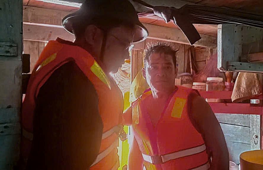 Thuyền viên Nguyễn Văn Lành (người bên phải) được Đồn Biên phòng Khánh Tiến cứu vớt đưa lên tàu an toàn