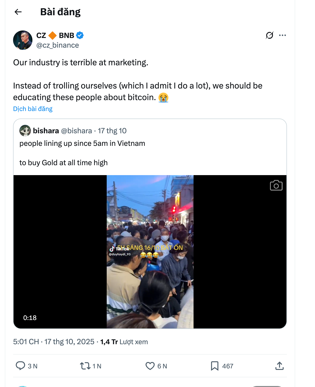 Ngày 17/10, tỷ phú tiền mã hóa Changpeng Zhao (CZ) chia sẻ lại đoạn video đám đông người xếp hàng chờ mua vàng được cho là tại Việt Nam. Sự việc diễn ra khi giá kim loại quý cán mốc cao nhất mọi thời đại ở thị trường thế giới. Cha đẻ sàn tiền số Binance cho rằng Bitcoin là sự lựa chọn tốt hơn.