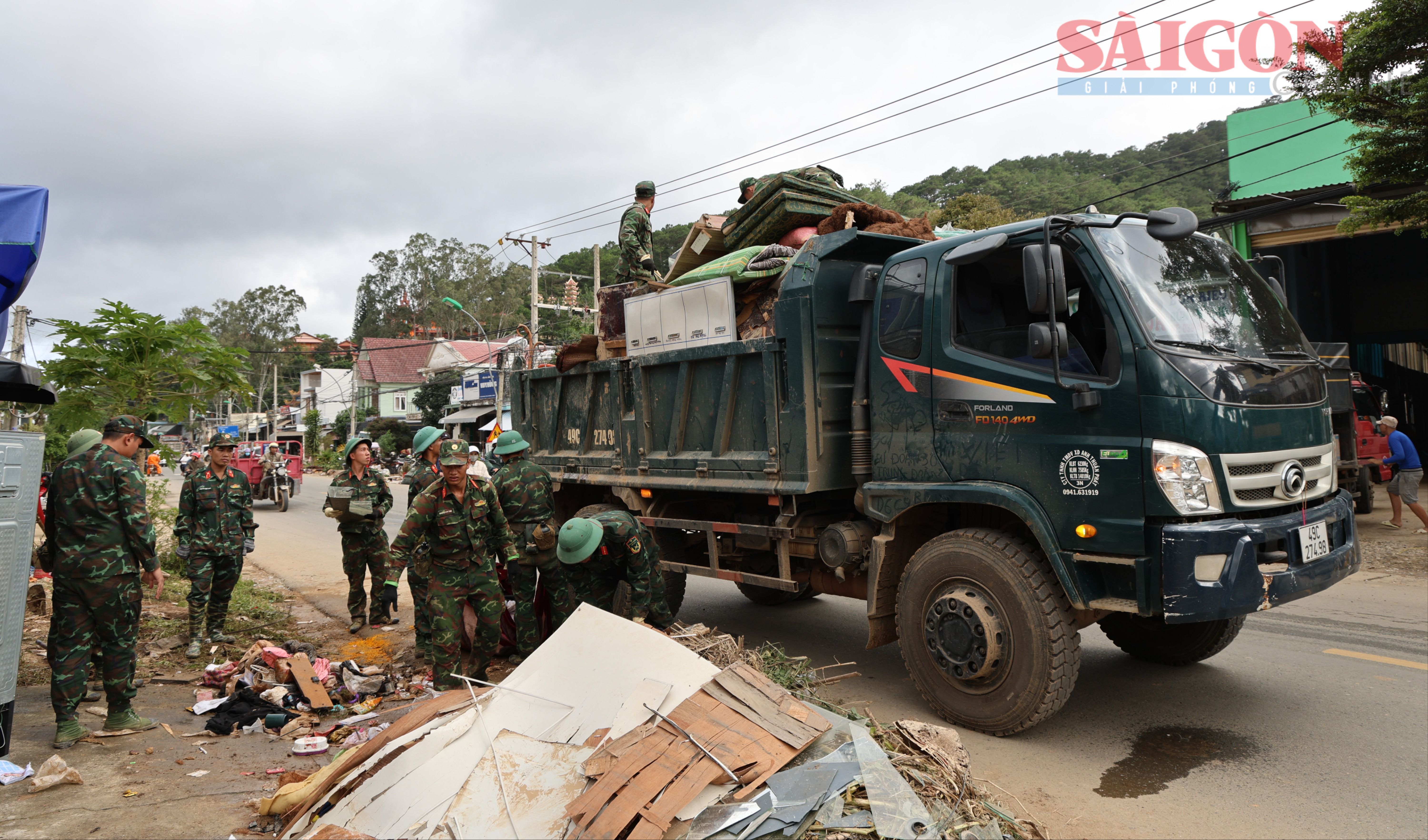 Cán bộ, chiến sĩ Sư đoàn 302, Quân khu 7 hỗ trợ người dân dọn dẹp nhà cửa, đường giao thông dọc quốc lộ 27 qua xã D'ran, tỉnh Lâm Đồng. Ảnh: ĐOÀN KIÊN