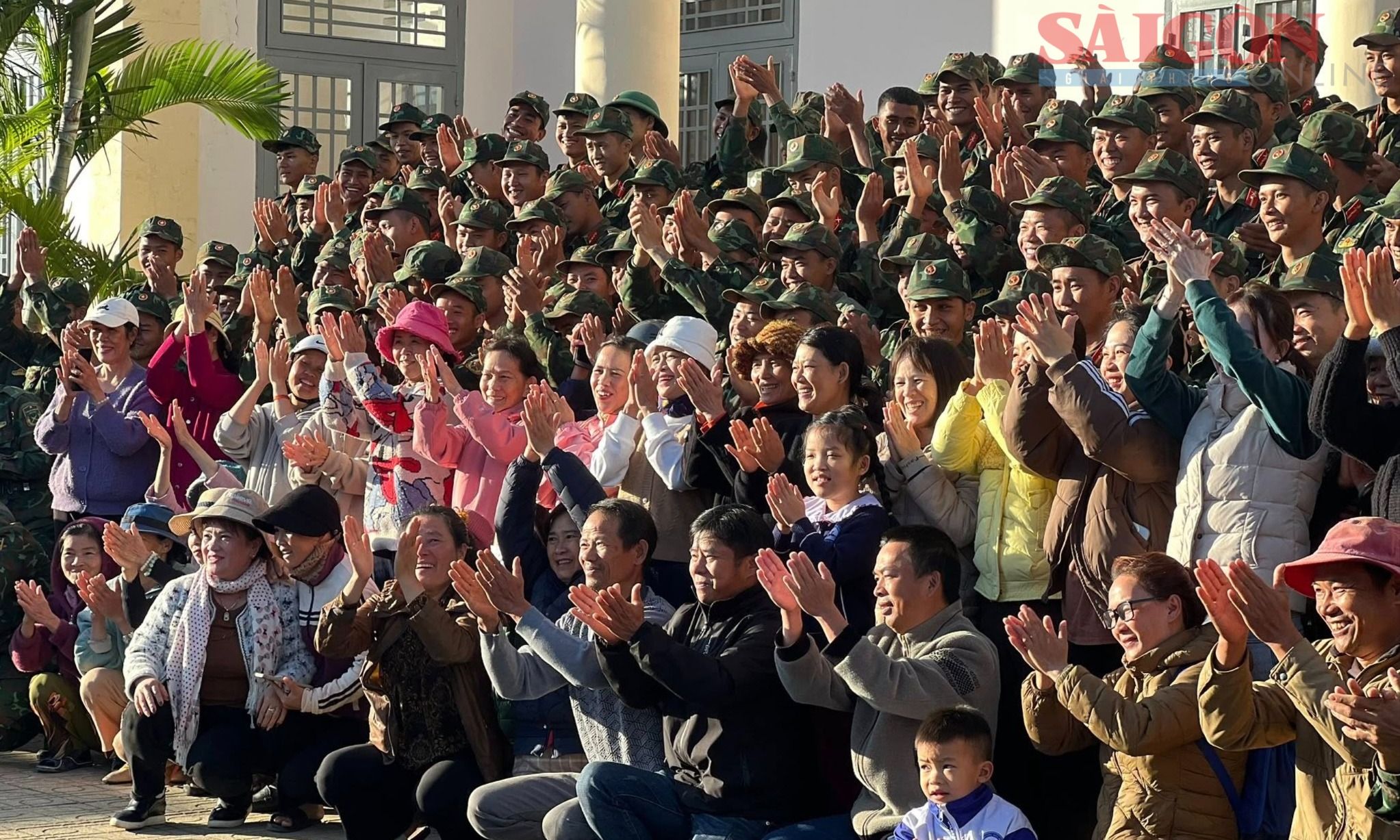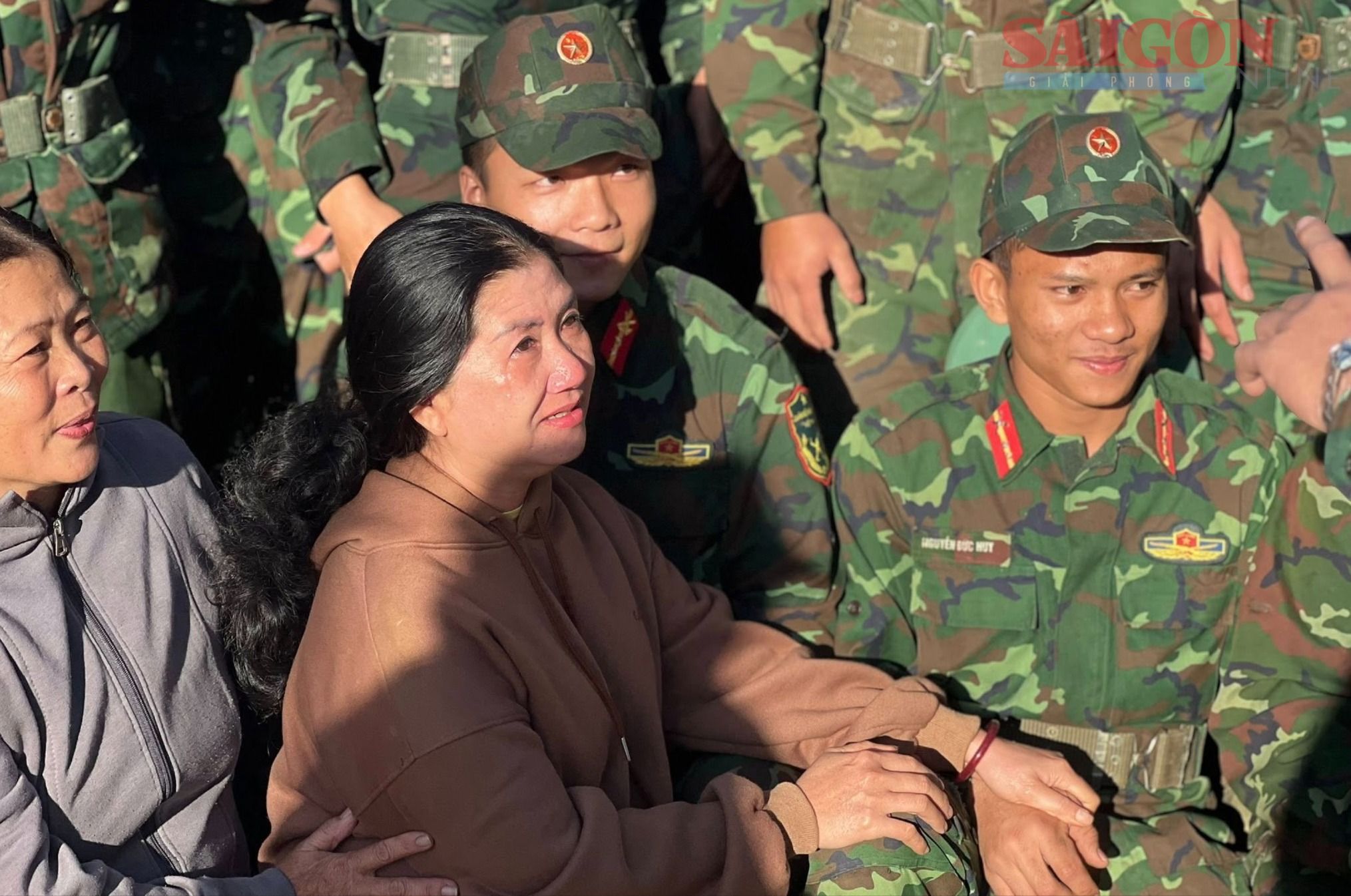 Người dân, chính quyền xã D'ran bịn rịn chia tay các cán bộ, chiến sĩ Quân khu 7 sáng 26-11. Ảnh: TRẦN TUẤN