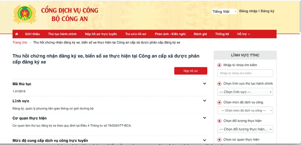Cổng dịch vụ công của Bộ Công an hướng dẫn đầy đủ, chi tiết các bước thực hiện thu hồi giấy chứng nhận đăng ký xe, biển số xe. (Ảnh chụp màn hình)