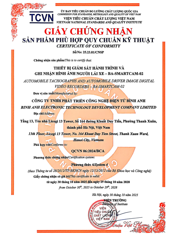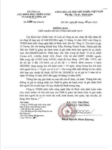 Mới đây, một chủng loại camera đầu tiên vượt qua các yêu cầu kỹ thuật và chính thức đạt chuẩn QCVN 06:2024/BCA và đã được Cục Khoa học Chiến lược và Lịch sử Công an – Bộ Công an tiếp nhận công bố hợp quy. Thiết bị BA-Smartcam-02 là thiết bị đầu tiên được chứng nhận đạt QCVN06:2024/BCA.