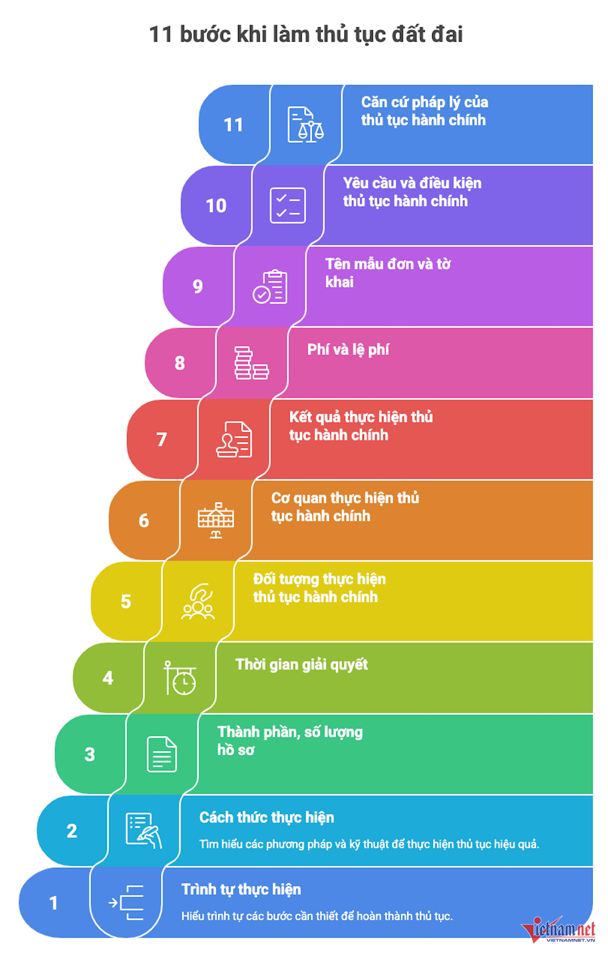 Theo đó đã quy định về từng thủ tục đất đai cụ thể, gồm: (1) Trình tự thực hiện; (2) Cách thức thực hiện; (3) Thành phần, số lượng hồ sơ; (4) Thời gian giải quyết; (5) Đối tượng thực hiện thủ tục hành chính; (6) Cơ quan thực hiện thủ tục hành chính; (7) Kết quả thực hiện thủ tục hành chính; (8) Phí, lệ phí; (9) Tên mẫu đơn, tờ khai; (10) Yêu cầu, điều kiện thực hiện thủ tục hành chính (nếu có); (11) Căn cứ pháp lý của thủ tục hành chính.