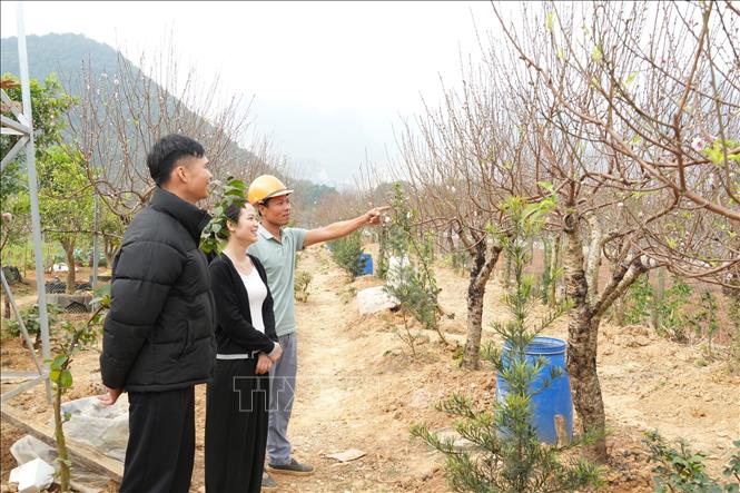 Khách hàng chọn mua hoa tại vườn đào gia đình anh Đồng Khắc Khoát, Tổ dân phố 5B, phường Trung Sơn, tỉnh Ninh Bình.