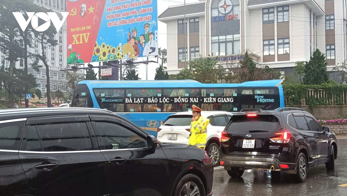 Cảnh sát giao thông Lâm Đồng hướng dẫn giao thông tại một giao lộ ở trung tâm Đà Lạt.