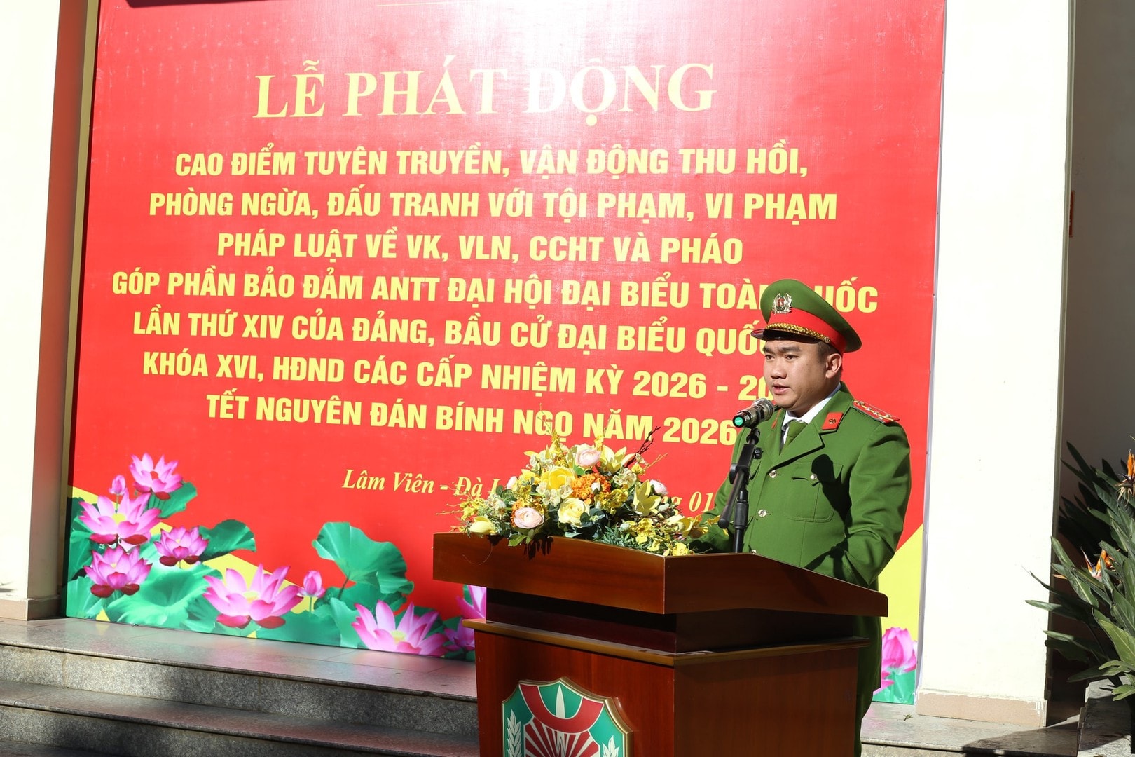 Phát biểu tại buổi lễ, Đại úy Lê Ngô Hồng Vũ, Trưởng Công an phường Lâm Viên nhấn mạnh, việc tàng trữ và sử dụng trái phép các loại vũ khí, vật liệu nổ là hành vi đặc biệt nguy hiểm, tiềm ẩn nguy cơ gây hậu quả nghiêm trọng về tính mạng và tài sản. Thực tế cho thấy nhiều vụ việc phức tạp xảy ra bắt nguồn từ sự chủ quan hoặc thiếu hiểu biết pháp luật của một bộ phận người dân, đặc biệt là thanh thiếu niên.
