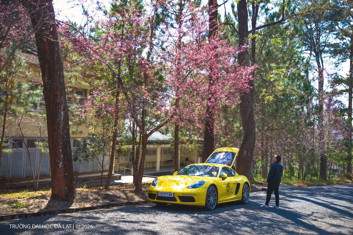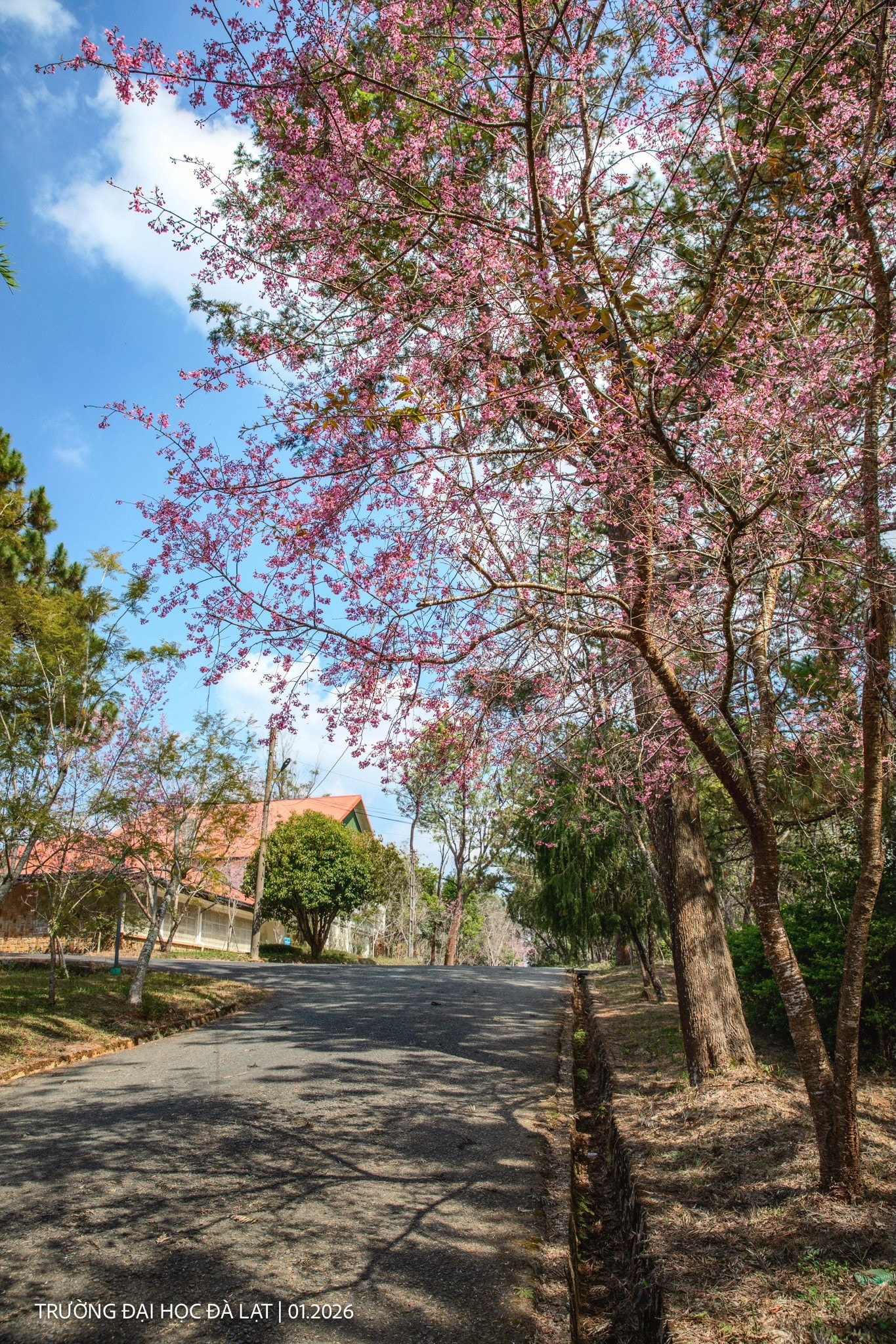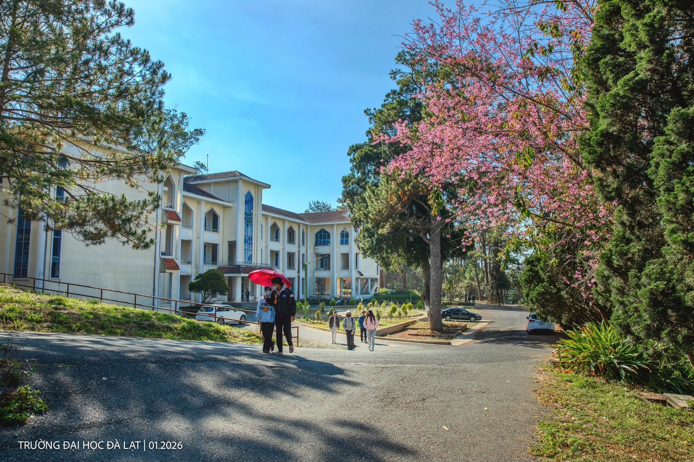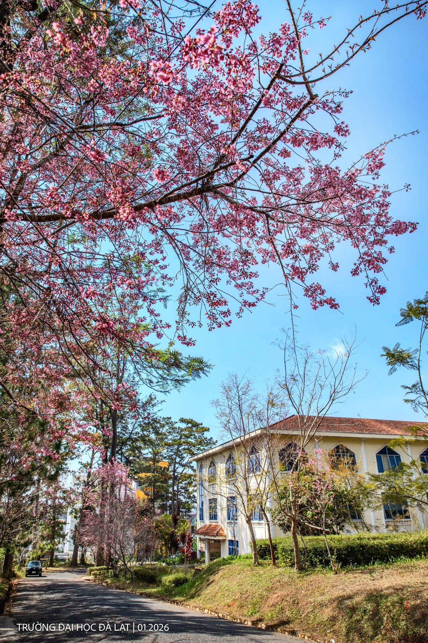 Trường Đại học Đà Lạt vốn nổi tiếng với lối kiến trúc cổ điển, nay lại càng trở nên thơ mộng hơn khi những hàng mai anh đào bắt đầu vào độ đẹp nhất. Khung cảnh tại đây được nhiều bạn trẻ ví như những thước phim điện ảnh đầy nghệ thuật.
