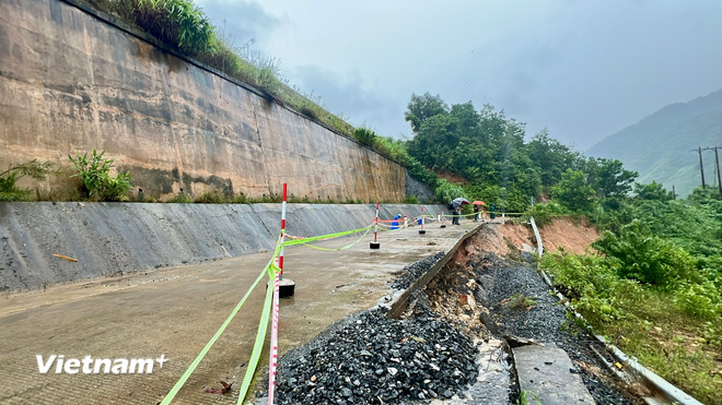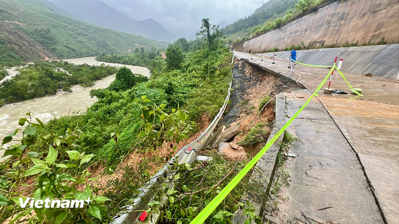 Vị trí sạt lở đường ĐT.601 gây ảnh hưởng đến cao tốc La Sơn - Hòa Liên - Túy Loan. (Ảnh: Thanh Phong/Vietnam+)
