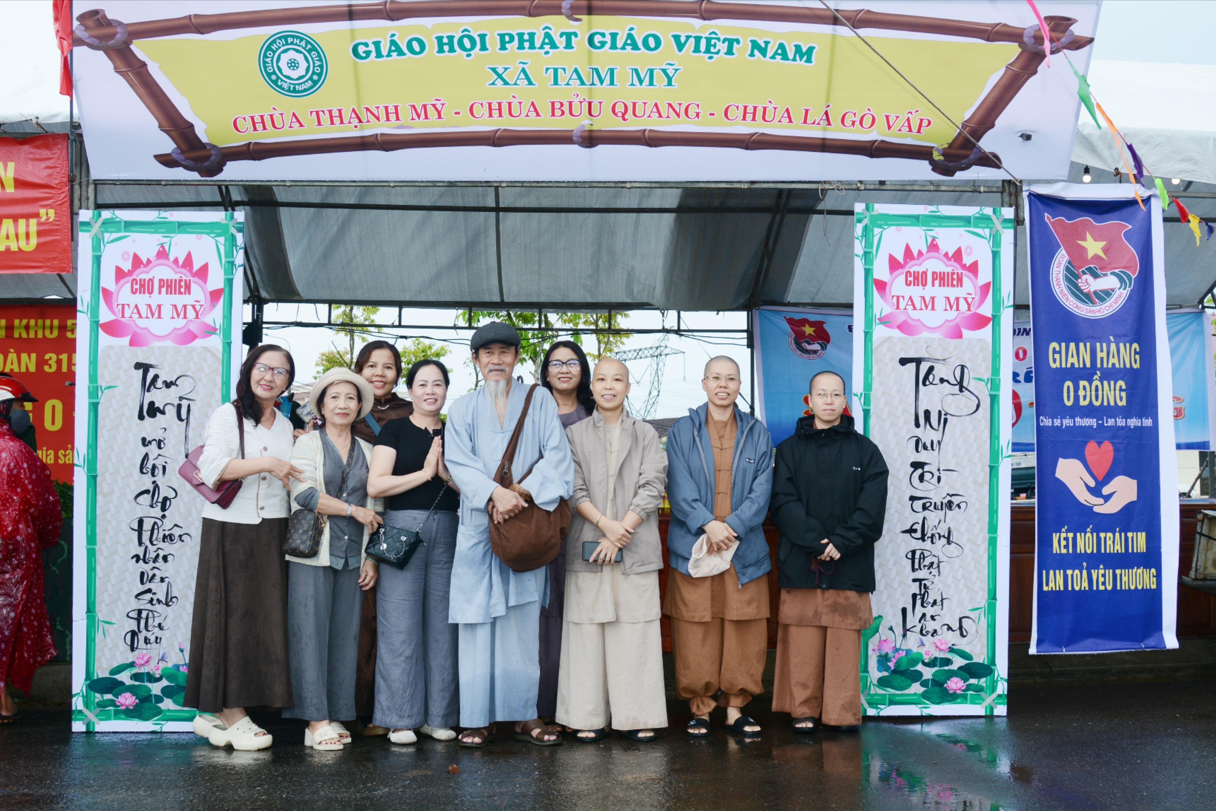 Đại diện 3 ngôi chùa tham gia chợ phiên 0 đồng vui vẻ chụp ảnh lưu niệm sau khi trao hết sản phẩm cho người dân