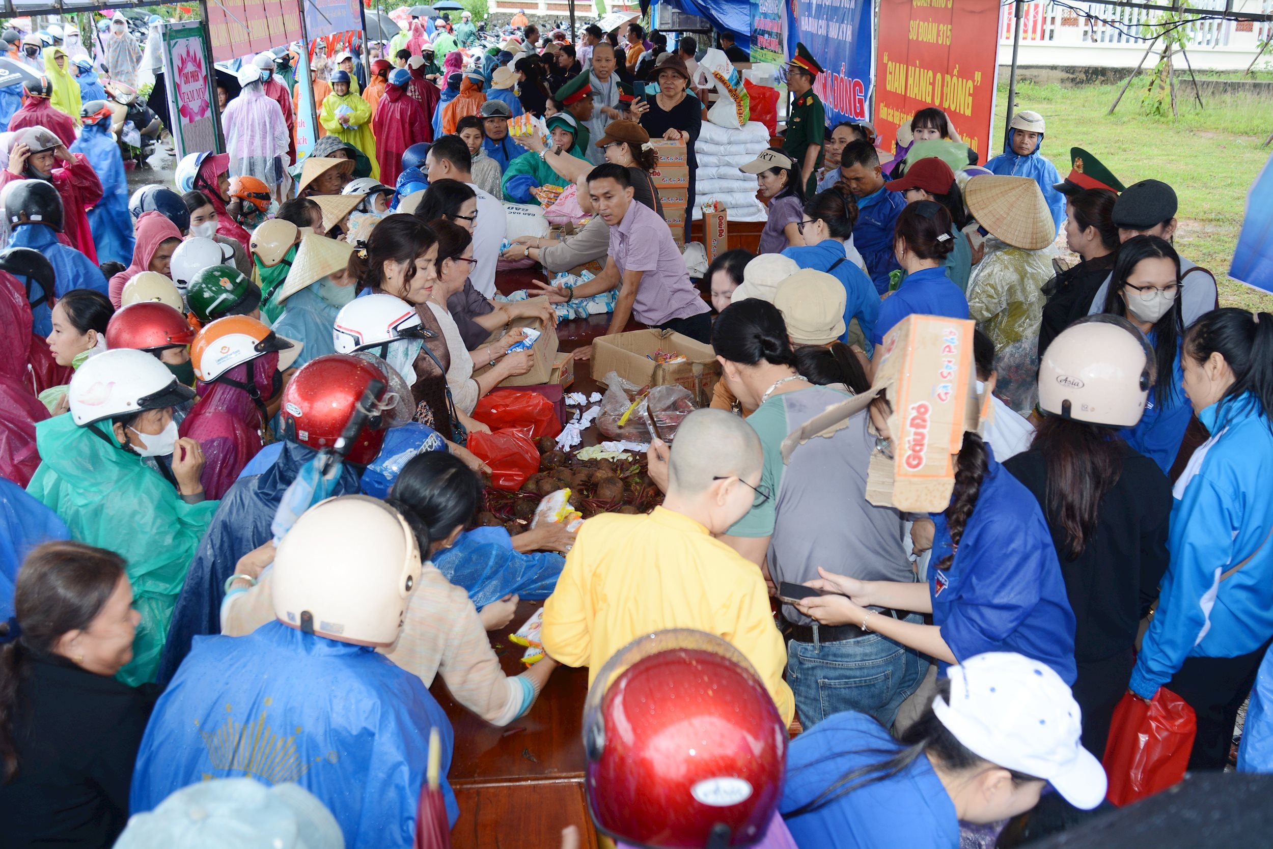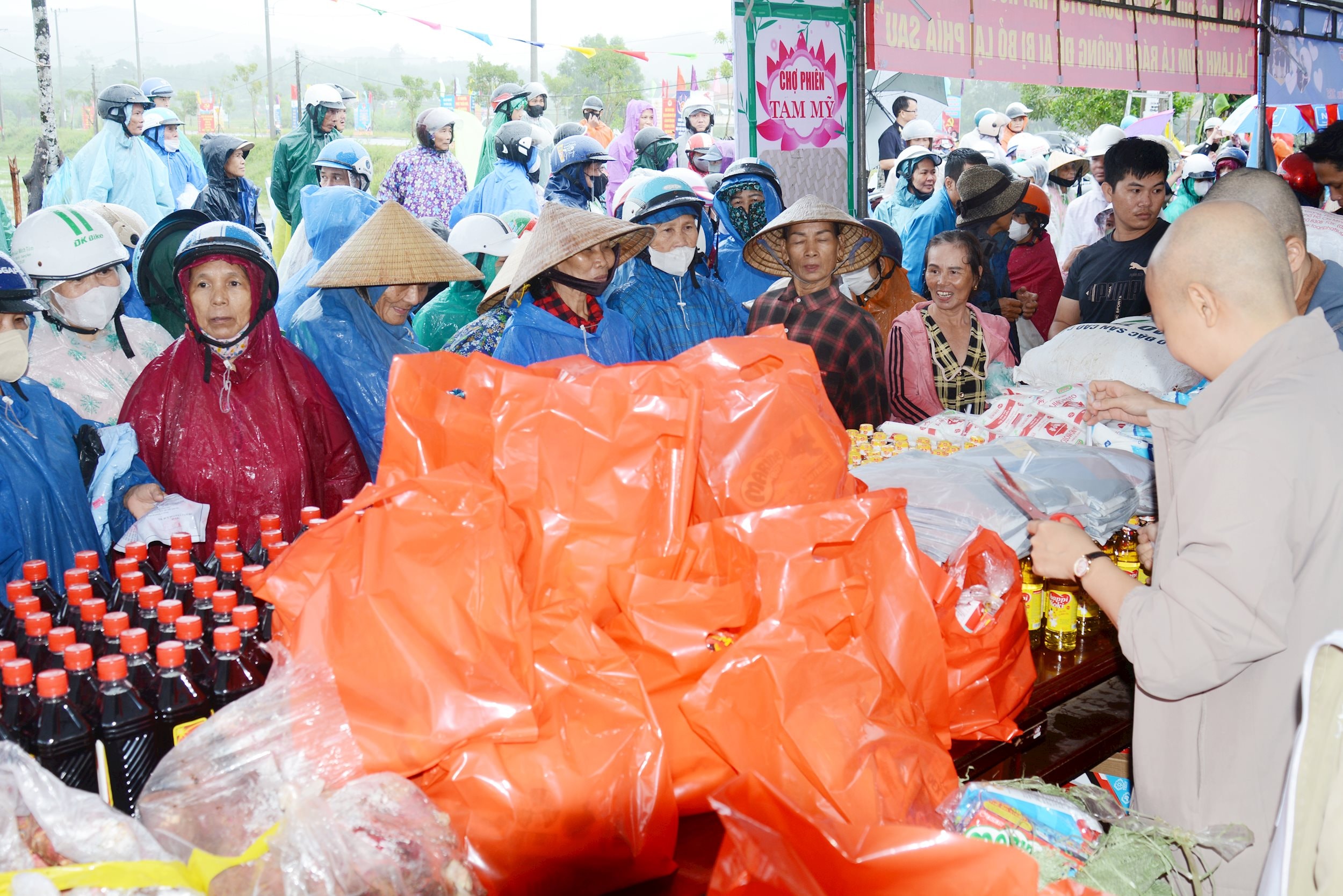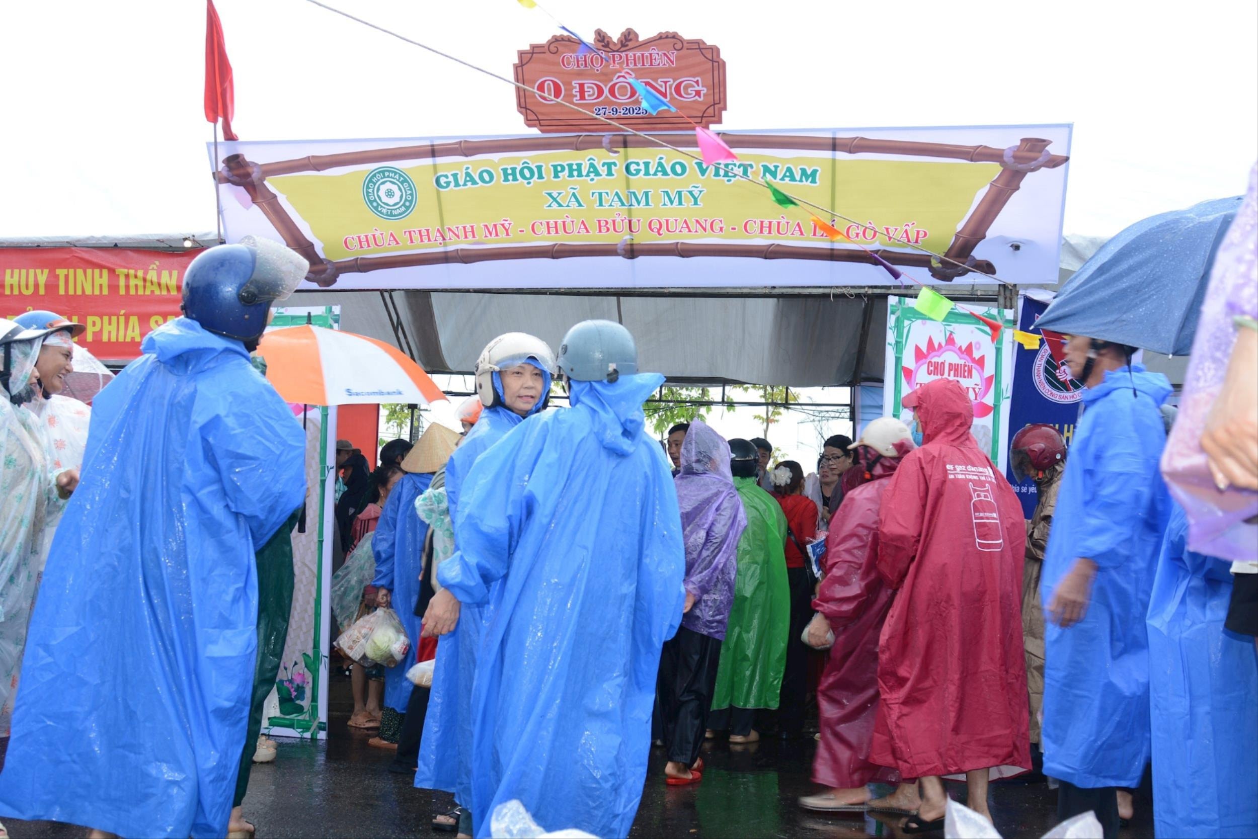 Mặc dù trời mưa nhưng hàng ngàn người dân vẫn mặc áo mưa đến chợ phiên 0 đồng để lựa chọn những sản phẩm thiết yếu cho mình. Điều đặc biệt là dù là sản phẩm miễn phí nhưng người dân vẫn cẩn trọng lựa chọn, chỉ lấy vừa đủ để nhường cho người khác.