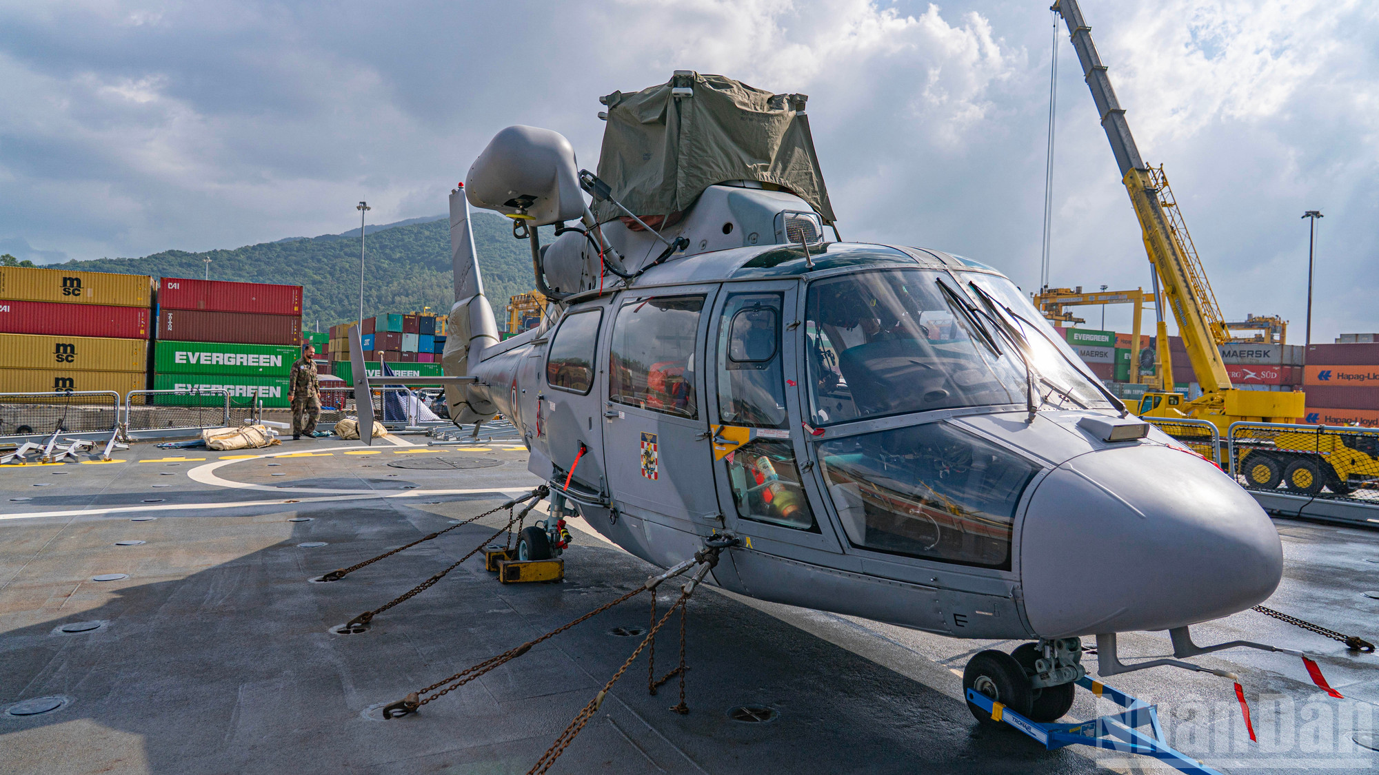 Khu vực sân đậu trực thăng trên boong tàu luôn túc trực những chiếc trực thăng sẵn sàng thực hiện các nhiệm vụ.