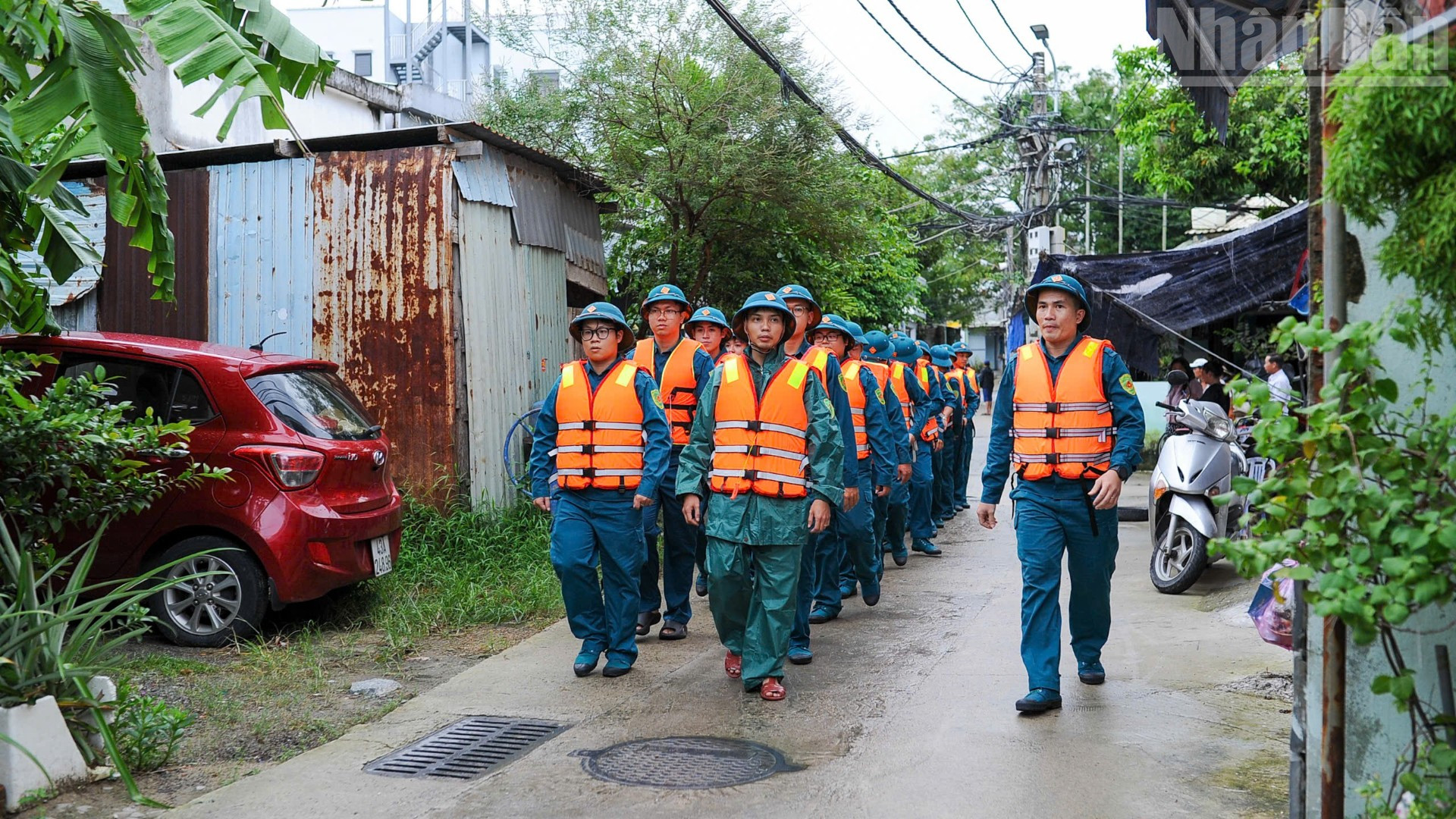 Lực lượng dân quân tự vệ Ban Chỉ huy Quân sự phường Thanh Khê (thành phố Đà Nẵng) ra quân giúp người dân khu vực Khe Cạn phòng, chống bão số 12.